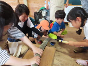 長友工務店へ行き、木育教室に参加してきました。園庭のせんだんの木を持って行き、のこぎりで切る体験をさせていただきました。初めて、のこぎりに触った子どもたち。長友工務店の方の指導を受けながら、一生懸命頑張って切る姿が見られました。切れると、大喜びで、においを嗅いだり、友だちに見せたりして嬉しそうにしていました。そのあと、パズルづくりにも挑戦しました。好きなキャラクターや今ひまわり組さんでブームな国富町のキャラクターしらたまちゃんの絵をかく様子が見られました。