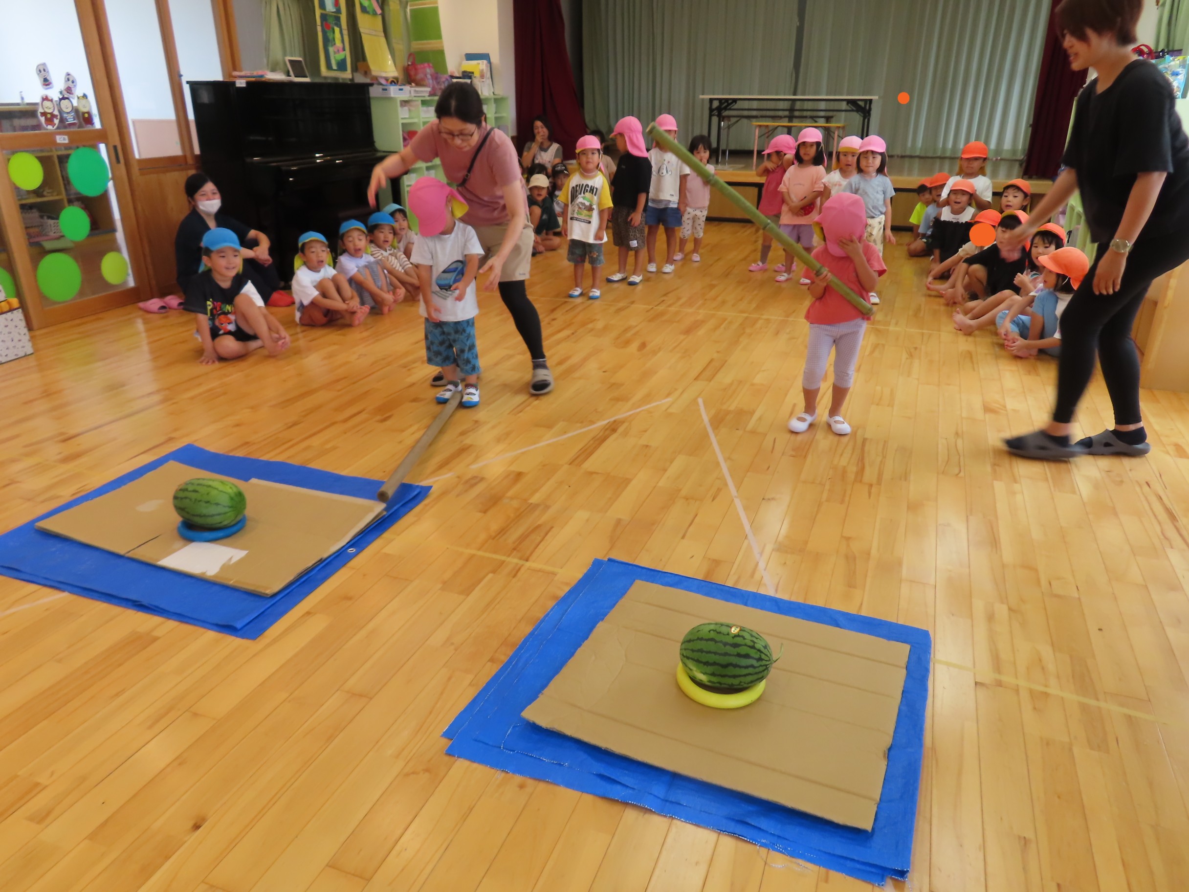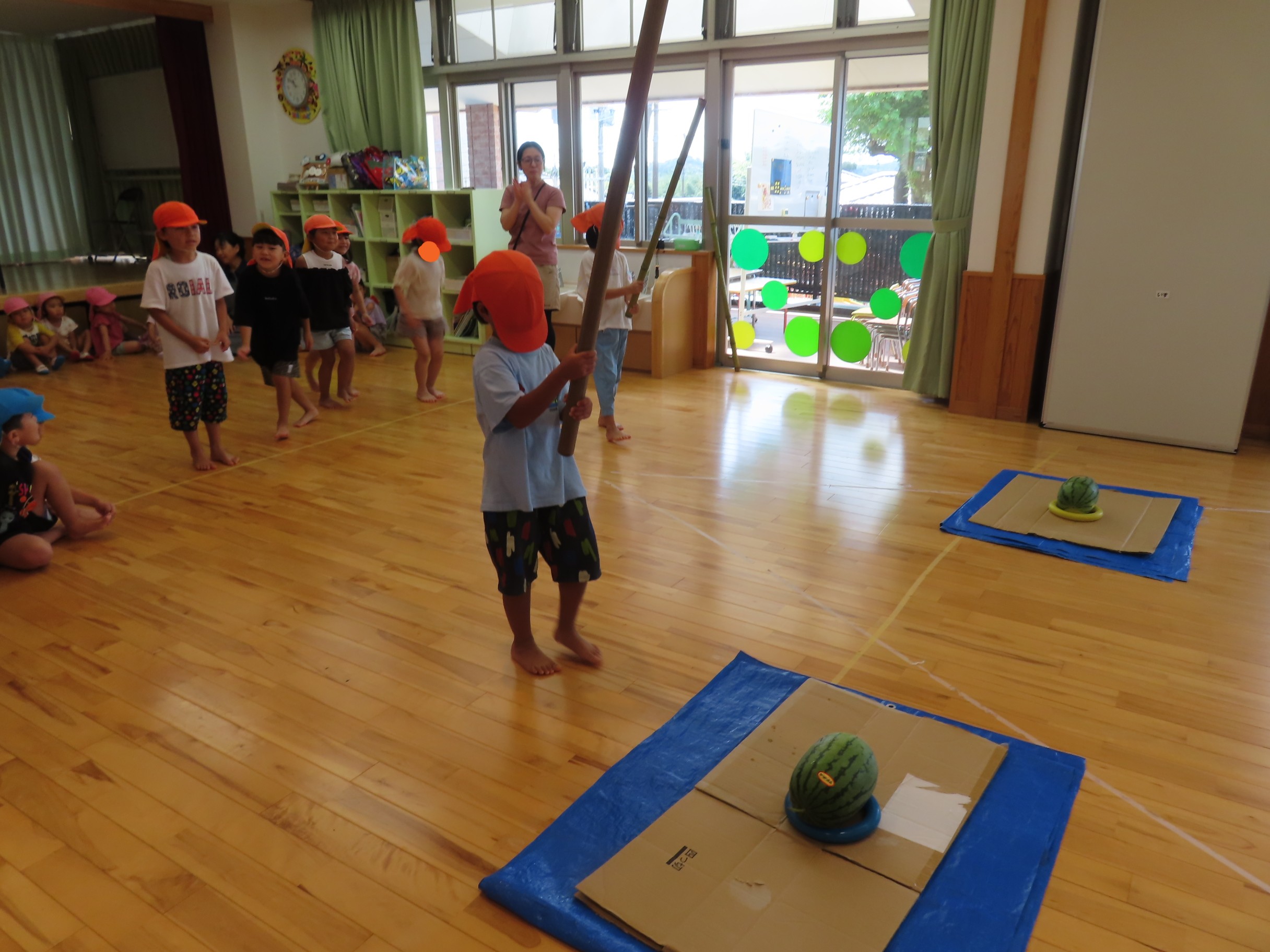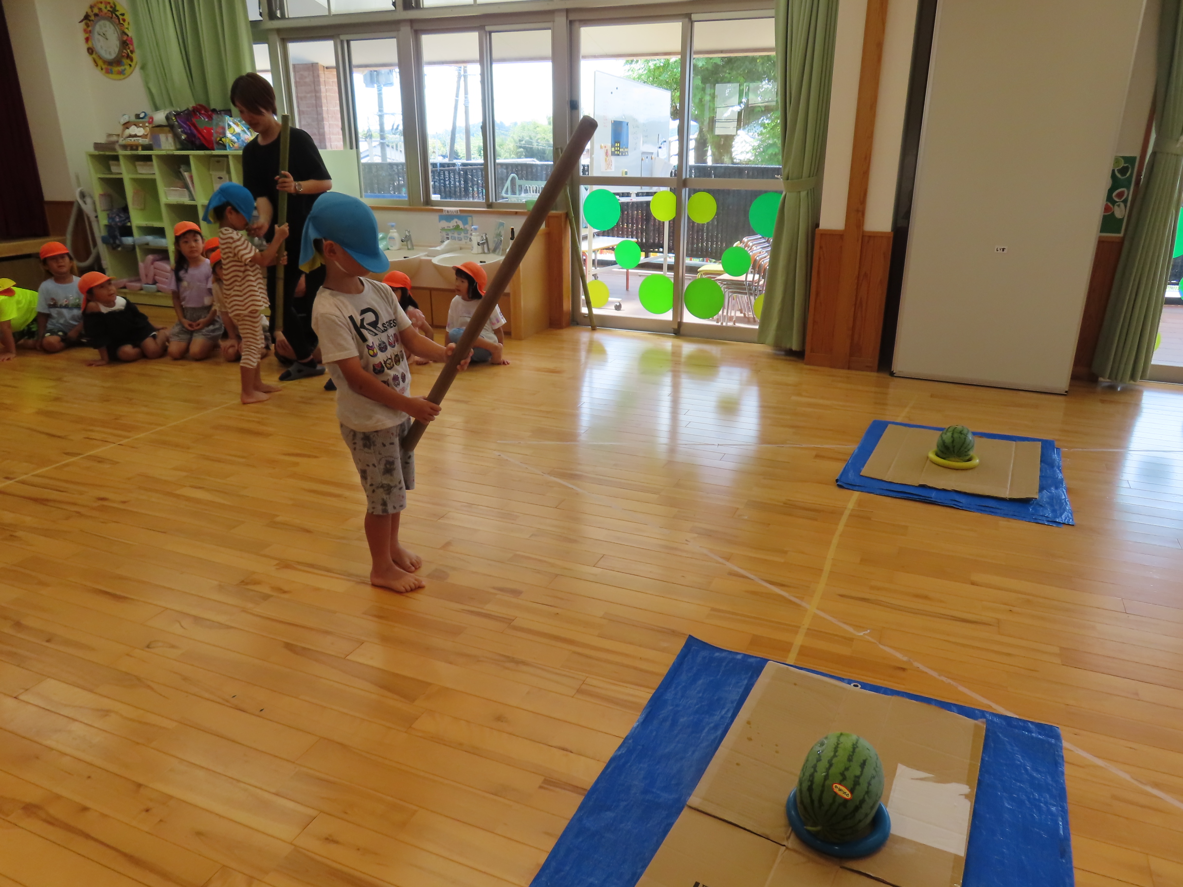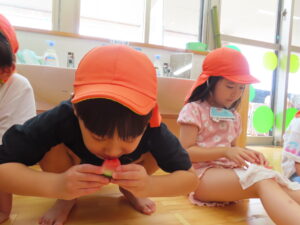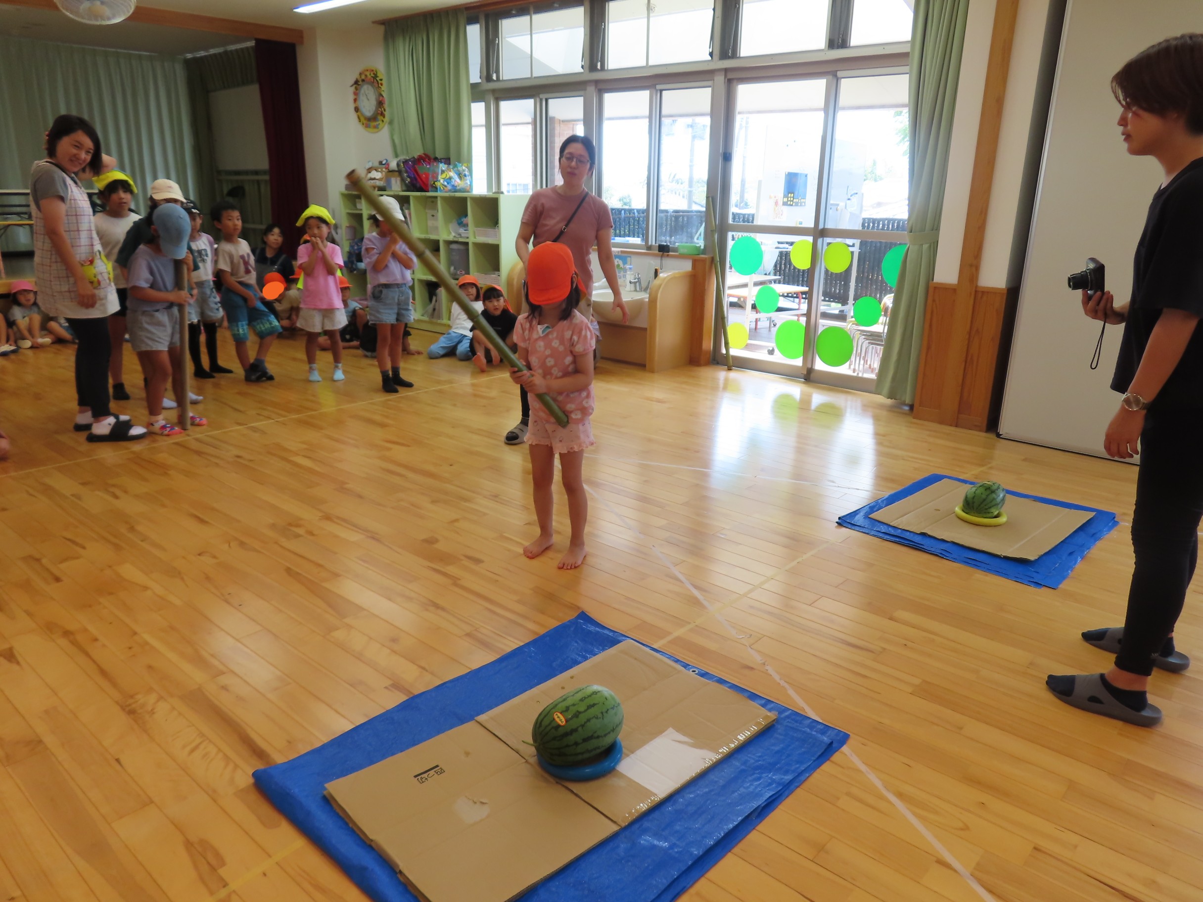 以上児と学童で、すいか割りをしました。帽子で目隠しをして、みんなの掛け声で少しずつ進む子どもたち。すいかに当たっても当たらなくても笑顔いっぱいで楽しんでいました。最後にすいかがきれいに割れると飛び跳ねて喜んでいましたよ。すいかが苦手な子も「おいしい」「おかわり」とおいしそうに食べていました。