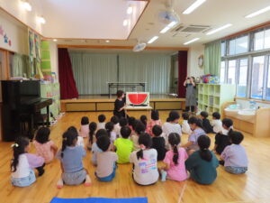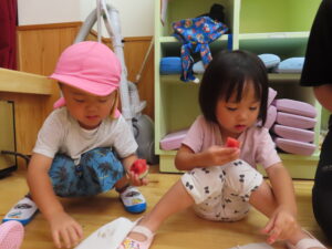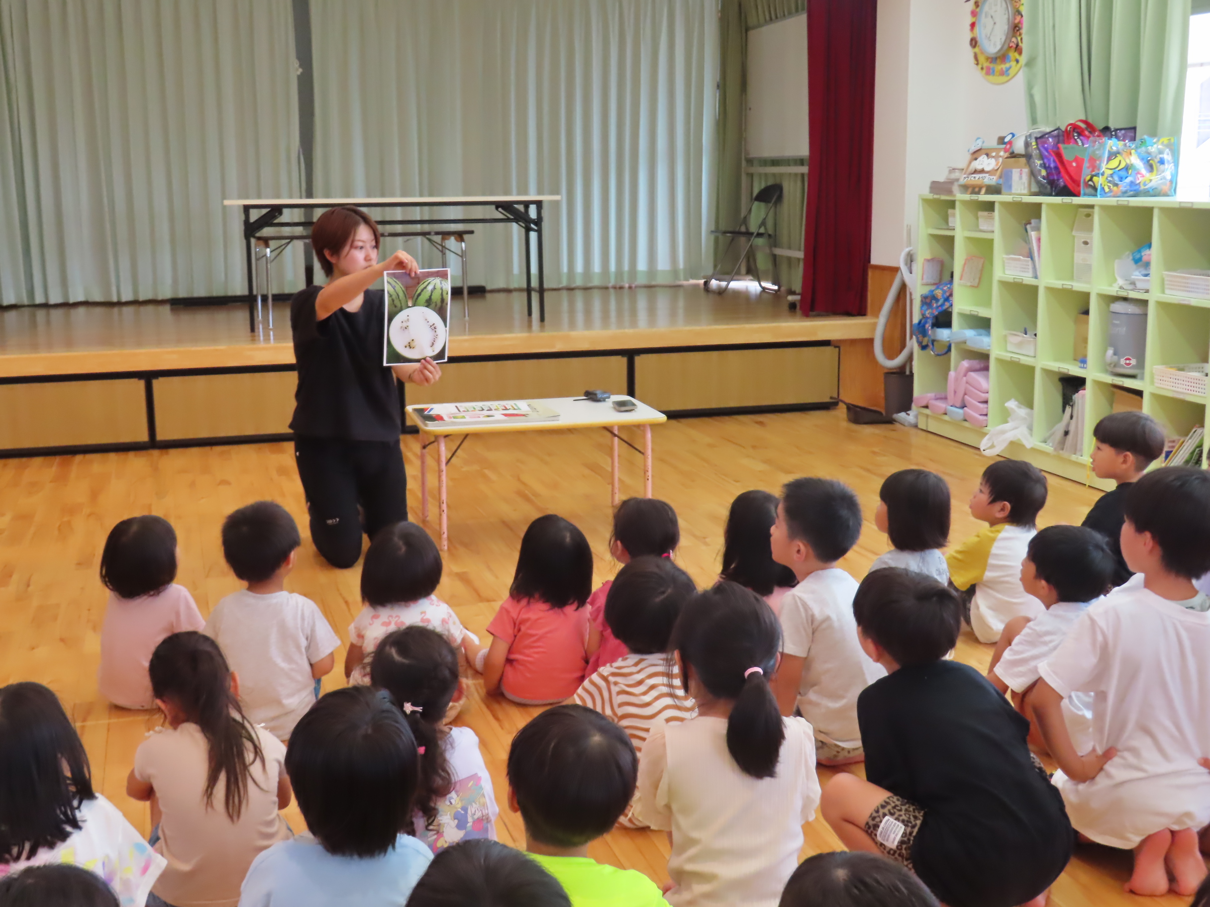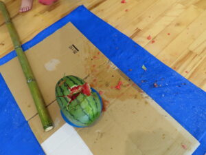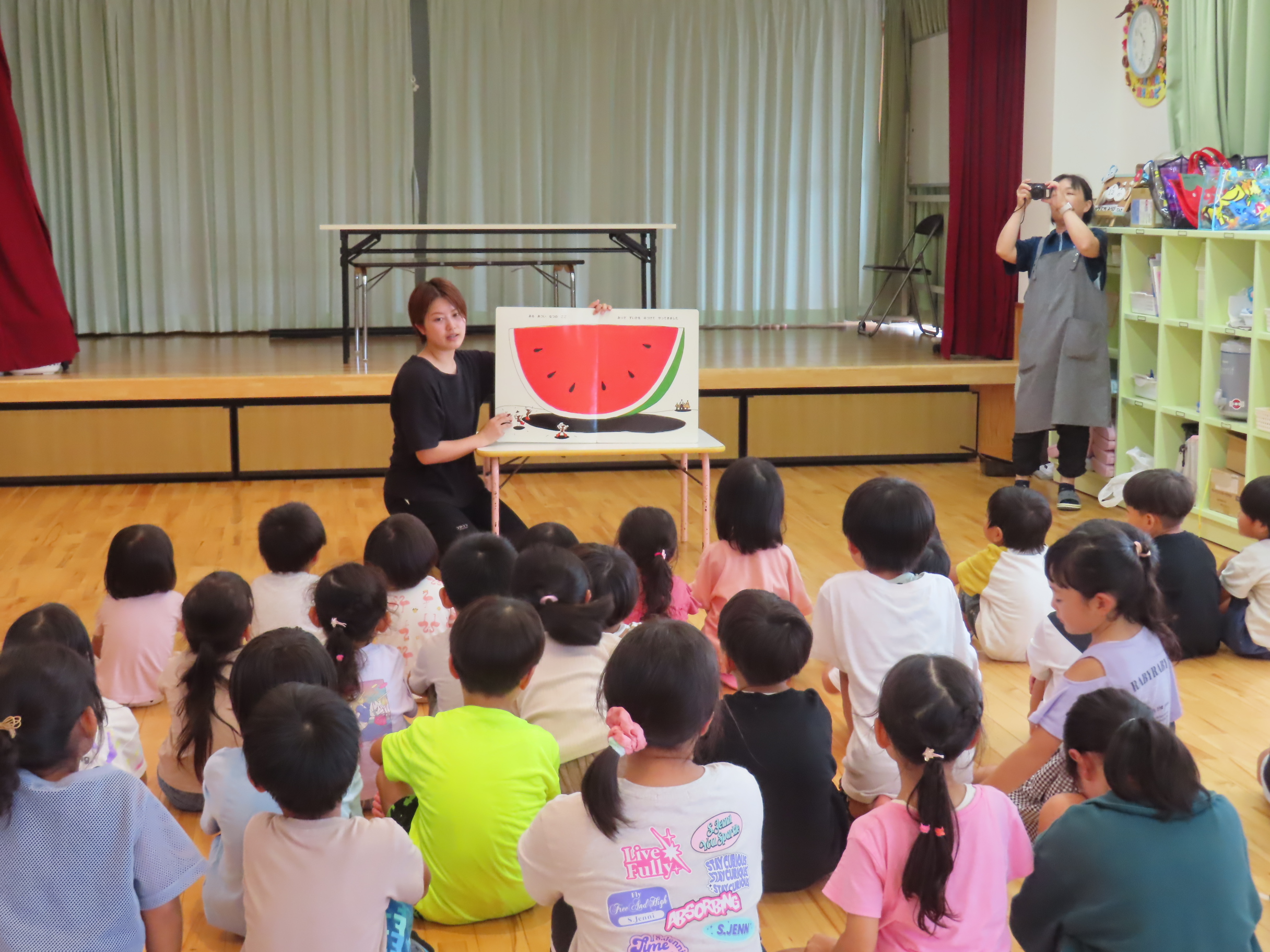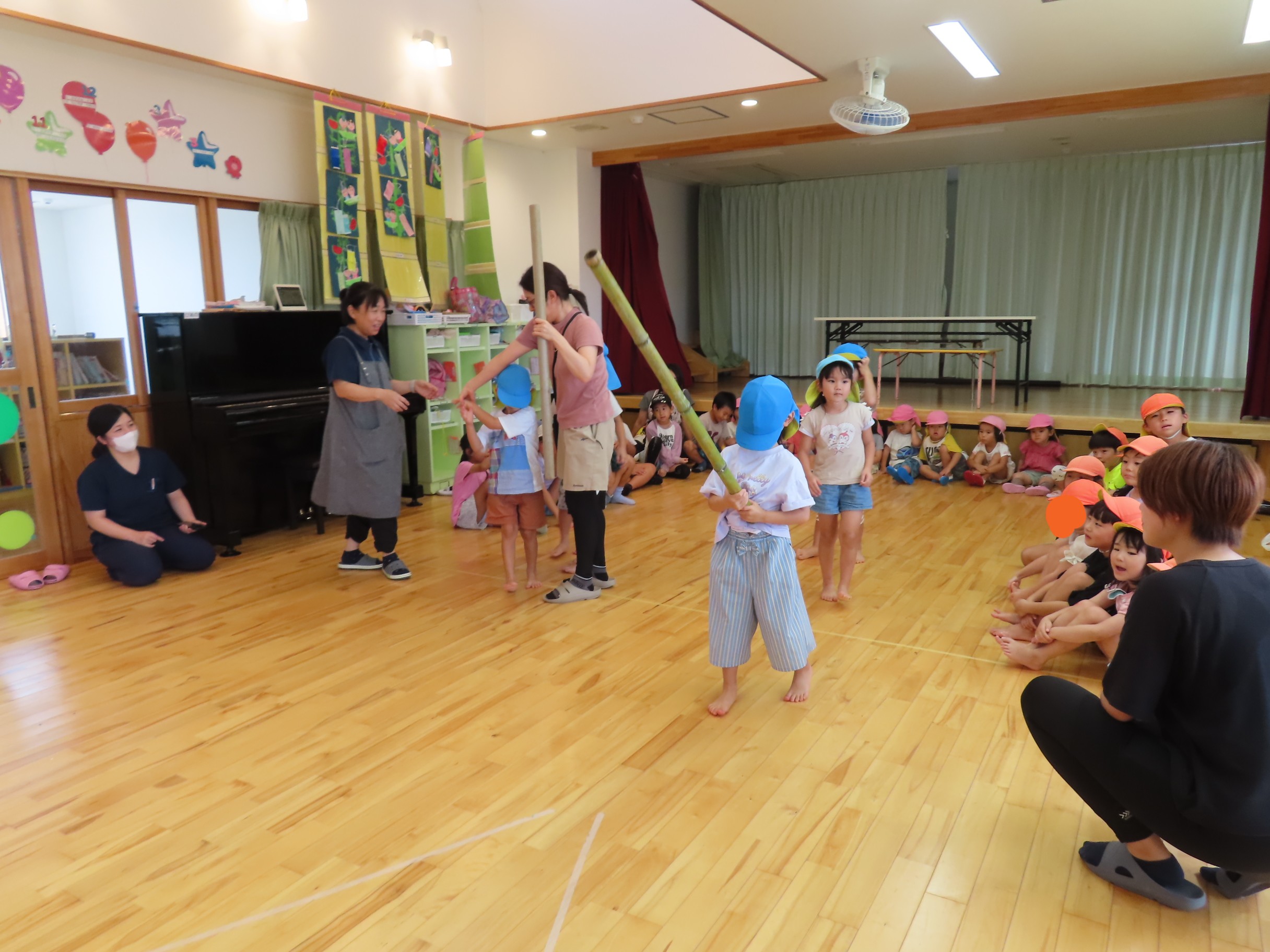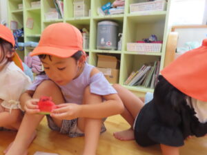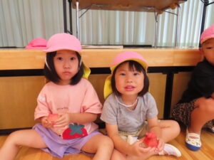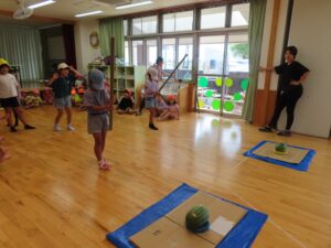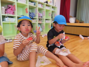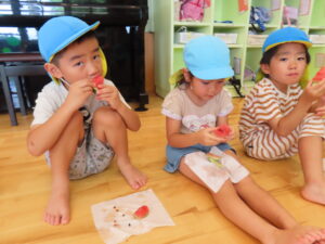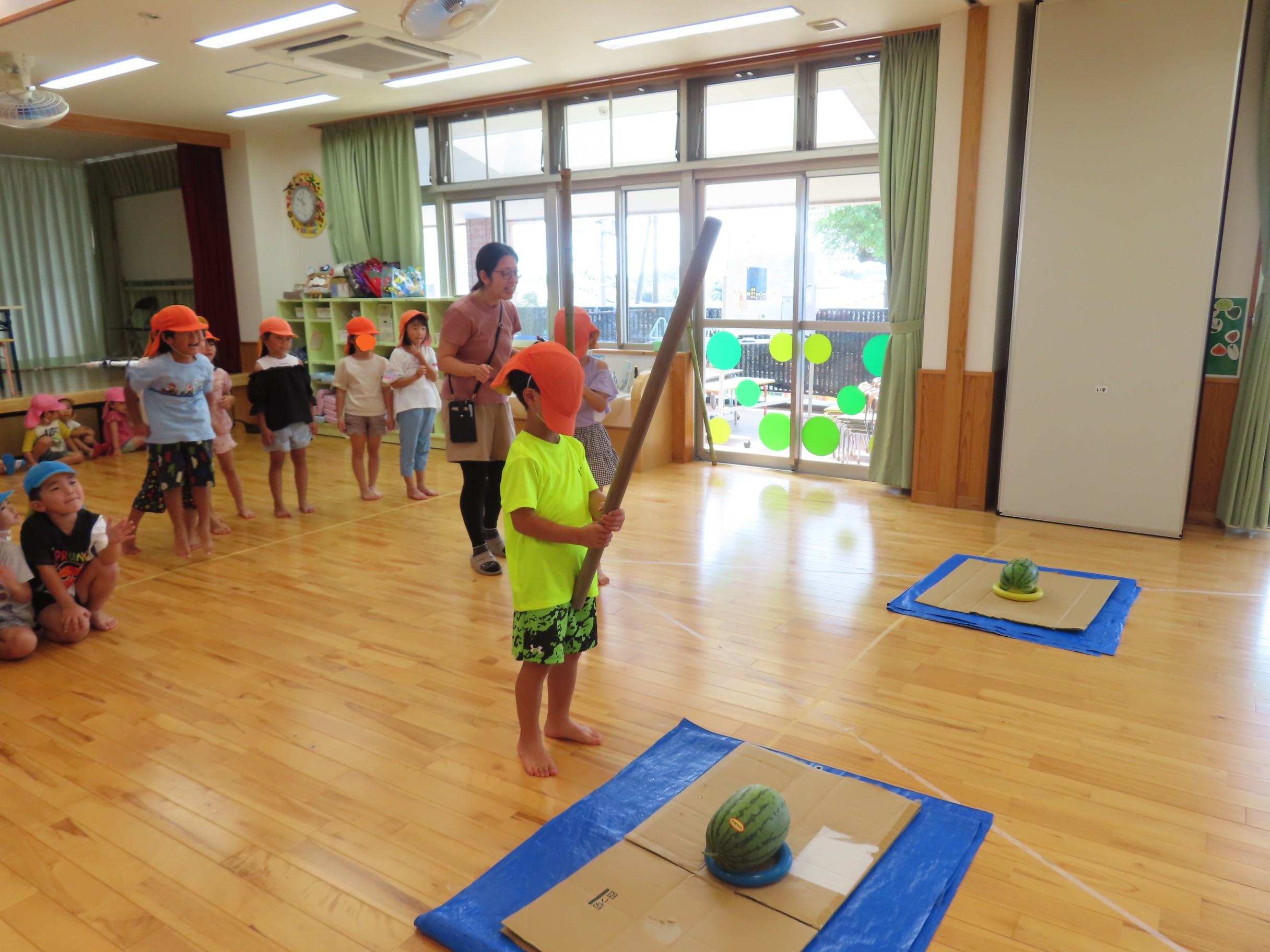 以上児と学童で、すいか割りをしました。帽子で目隠しをして、みんなの掛け声で少しずつ進む子どもたち。すいかに当たっても当たらなくても笑顔いっぱいで楽しんでいました。最後にすいかがきれいに割れると飛び跳ねて喜んでいましたよ。すいかが苦手な子も「おいしい」「おかわり」とおいしそうに食べていました。