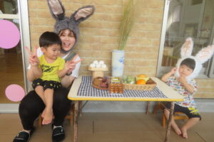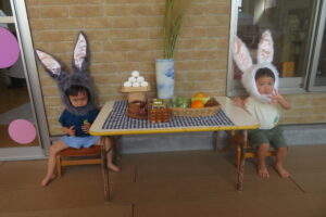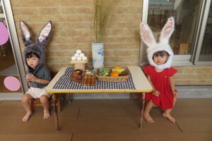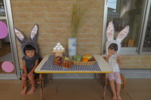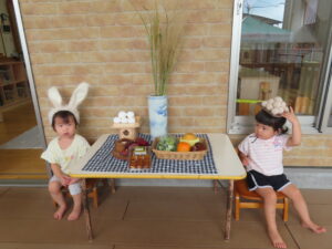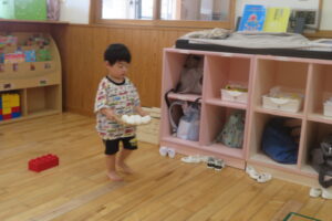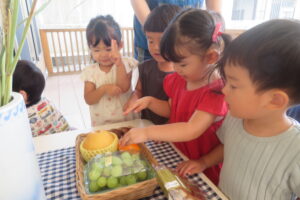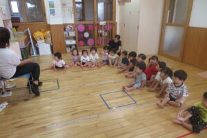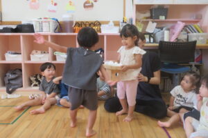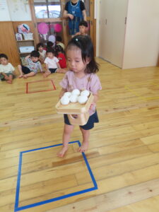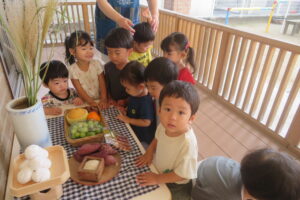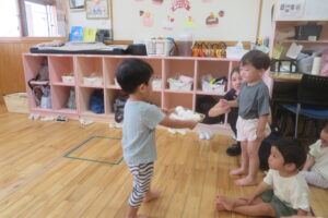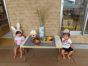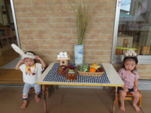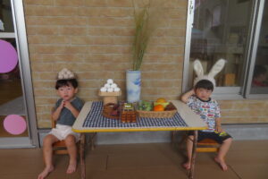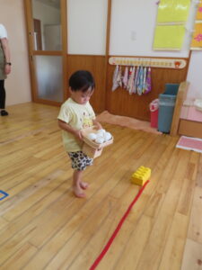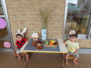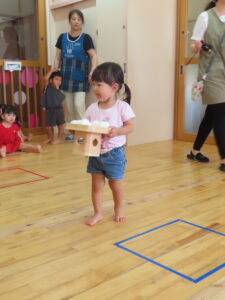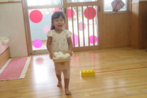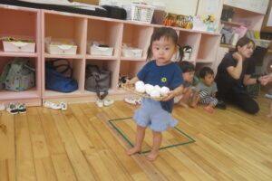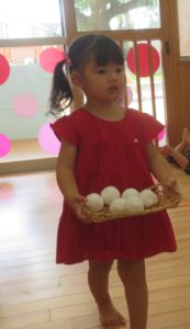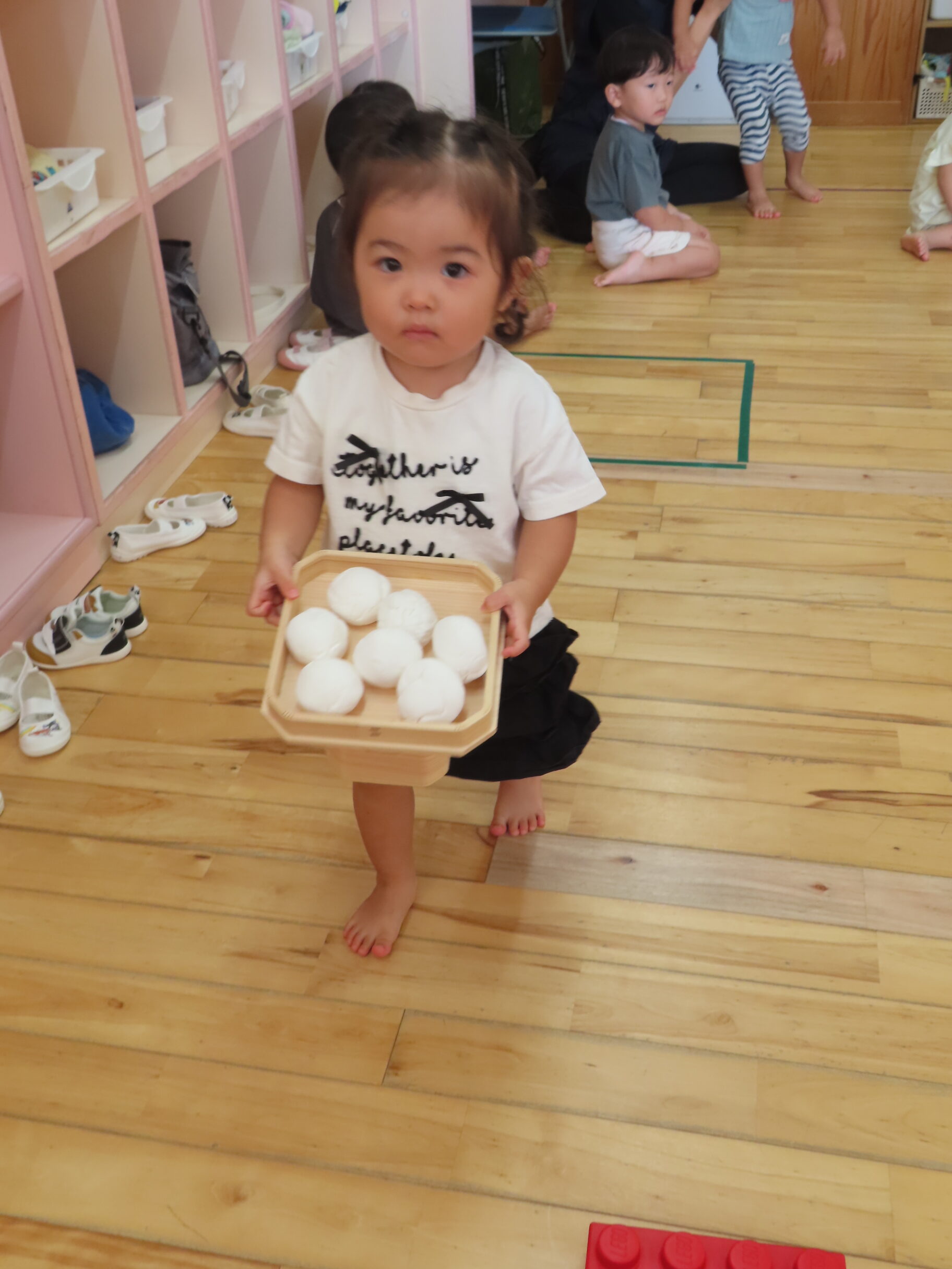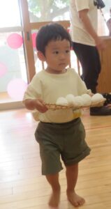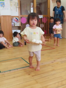「やまねこせんせいの こんやはおつきみ」の絵本を見て、お団子運びゲームをしました。お団子を落とさないように慎重に運んだ子ども達です。色々な表情を見せてくれて可愛かったです。