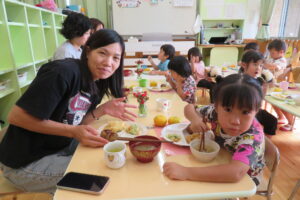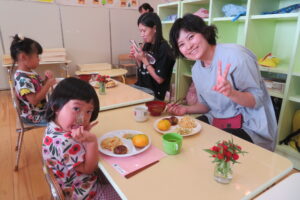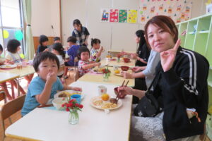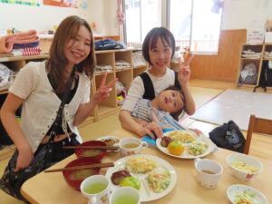 給食のハンバーグは、おいしいとおうちの方と会話しながら、笑顔いっぱいで、食べていましたよ。