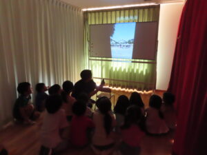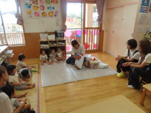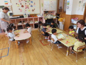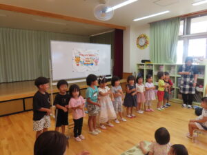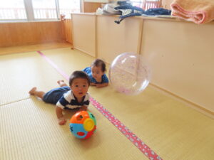 誕生会後は、クラスに分かれて、活動を行いました。ボール遊びやパネルシアター、パズル、じゃんけん列車を楽しんでいました。年中、年長さんは、運動会で行う予定のバルーンを動画で見て、研究し、さらにやる気満々になった様子でした。