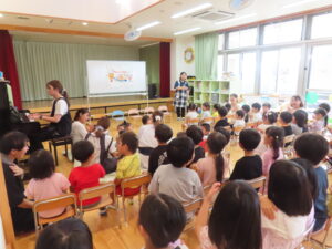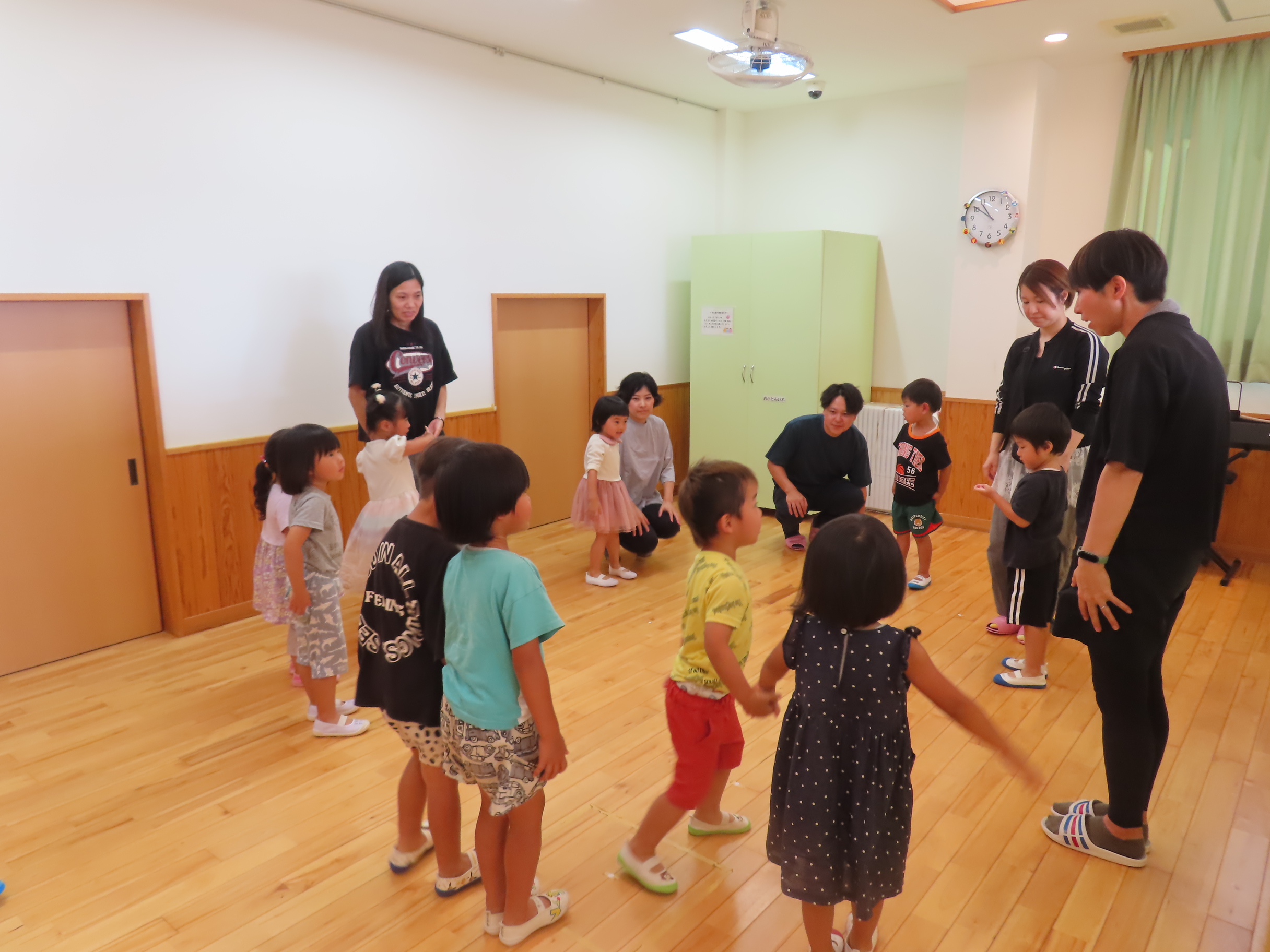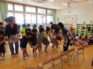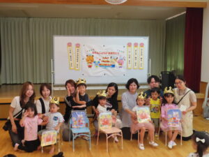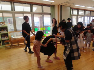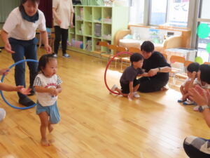 10月生まれの誕生会がありました。前に出てくると少し恥ずかしそうな様子もありましたが、質問にもしっかり答えることができていました。お父さん、お母さんと一緒に輪くぐりゲームをすると、笑顔いっぱいで自分のチームを応援する様子があり、とても盛り上がりましたよ。