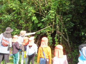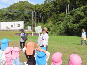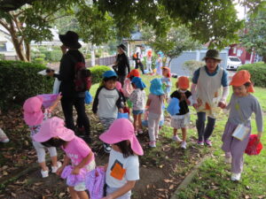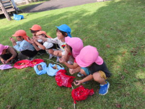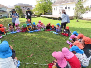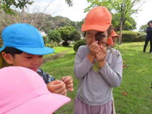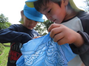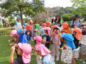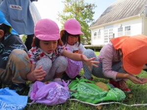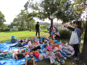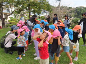 今日、以上児は、緑化推進機構の方や役場の方、様々な方の協力を得て、森育に参加することができました。近隣散策をして、木に巻きついているかずらを見たり、尖った木やもこもこした木があることを発見したり、いつもの散歩よりもより自然を感じられる体験ができました。公園に着くと、どんぐりや椿の種を拾ったり、ふうの実を見つけ、トゲトゲしている感触を楽しんだりしました。ブルーシートに寝転んで、風の音や木の葉が落ちてくる様子を見たりもしました。