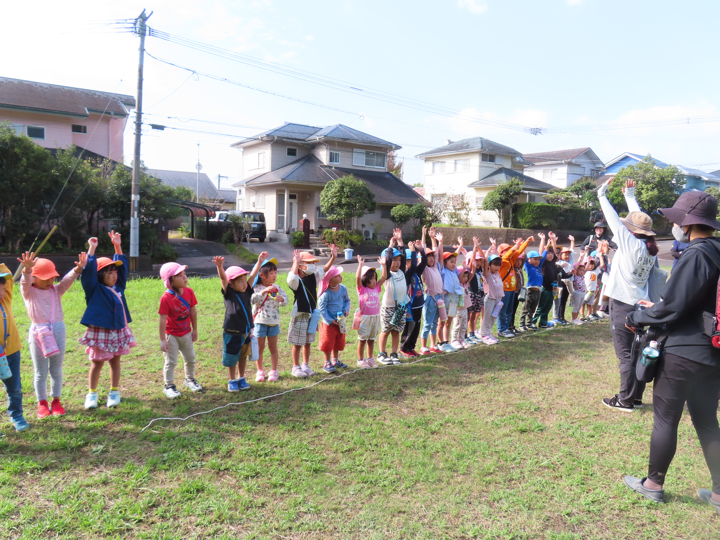 今日、以上児は、緑化推進機構の方や役場の方、様々な方の協力を得て、森育に参加することができました。近隣散策をして、木に巻きついているかずらを見たり、尖った木やもこもこした木があることを発見したり、いつもの散歩よりもより自然を感じられる体験ができました。公園に着くと、どんぐりや椿の種を拾ったり、ふうの実を見つけ、トゲトゲしている感触を楽しんだりしました。ブルーシートに寝転んで、風の音や木の葉が落ちてくる様子を見たりもしました。