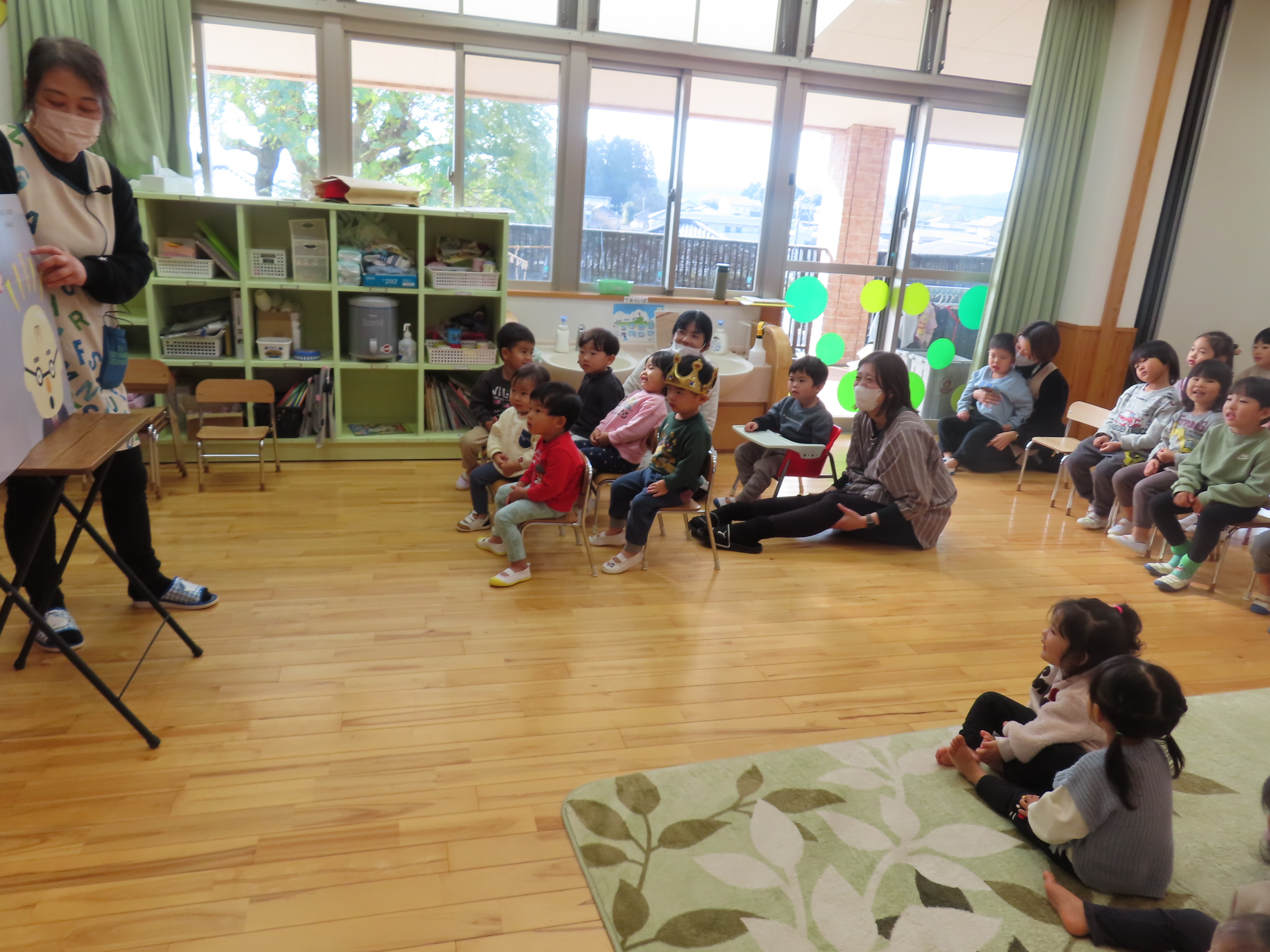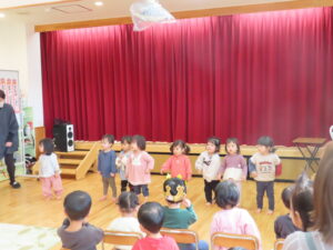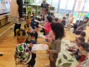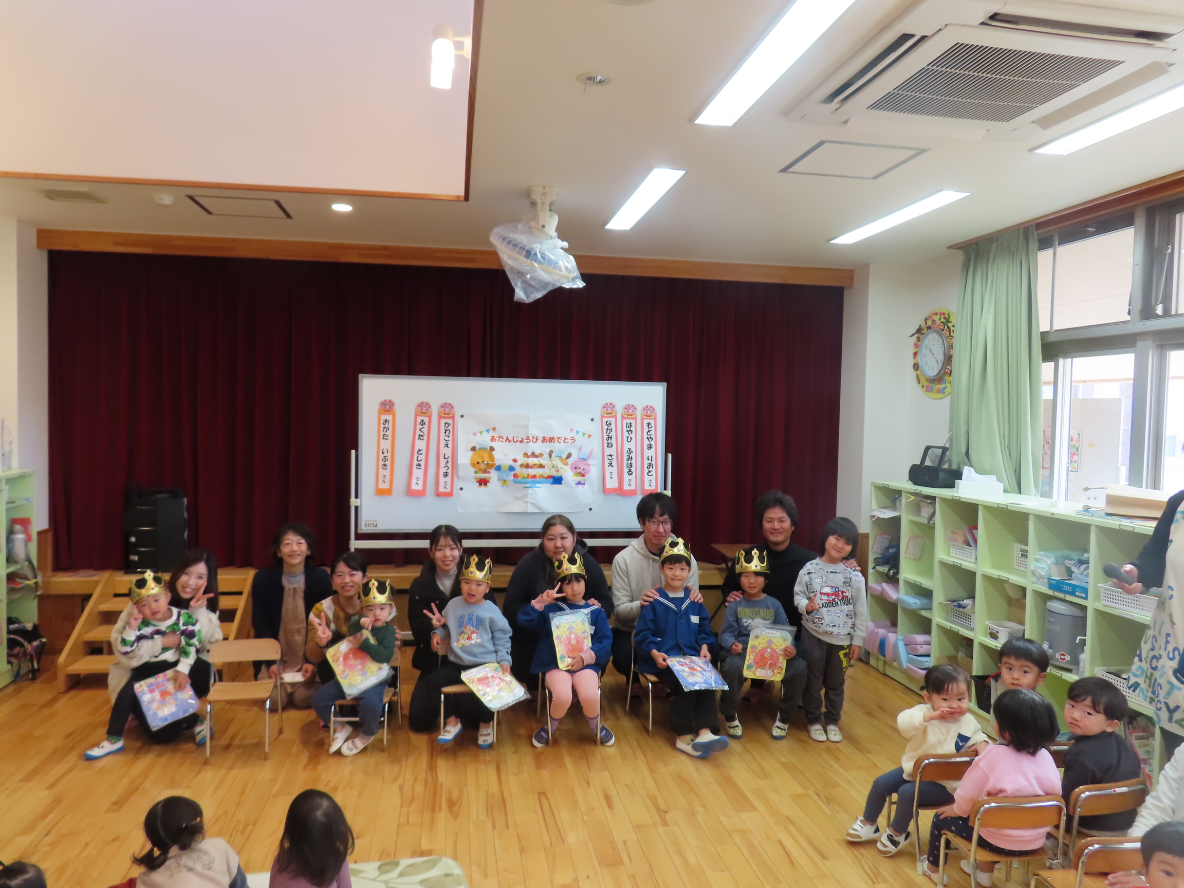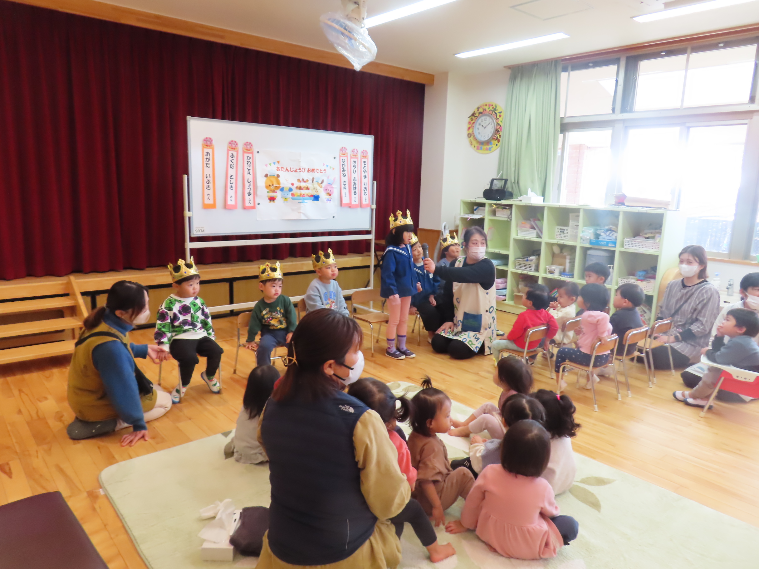 12月生まれの誕生会がありました。質問コーナーでは、12月生まれのお友だちに好きな果物や車を聞きました。みんな大きな声で、「りんご!」「シエンタ」など答えてくれましたよ。出し物では、大型絵本の紙芝居を見て大笑いしたり、発表会で踊った曲をみんなの前で披露したりして楽しく過ごしました。給食もおうちの人と食べれて嬉しそうな12月生まれの子どもたちでした。