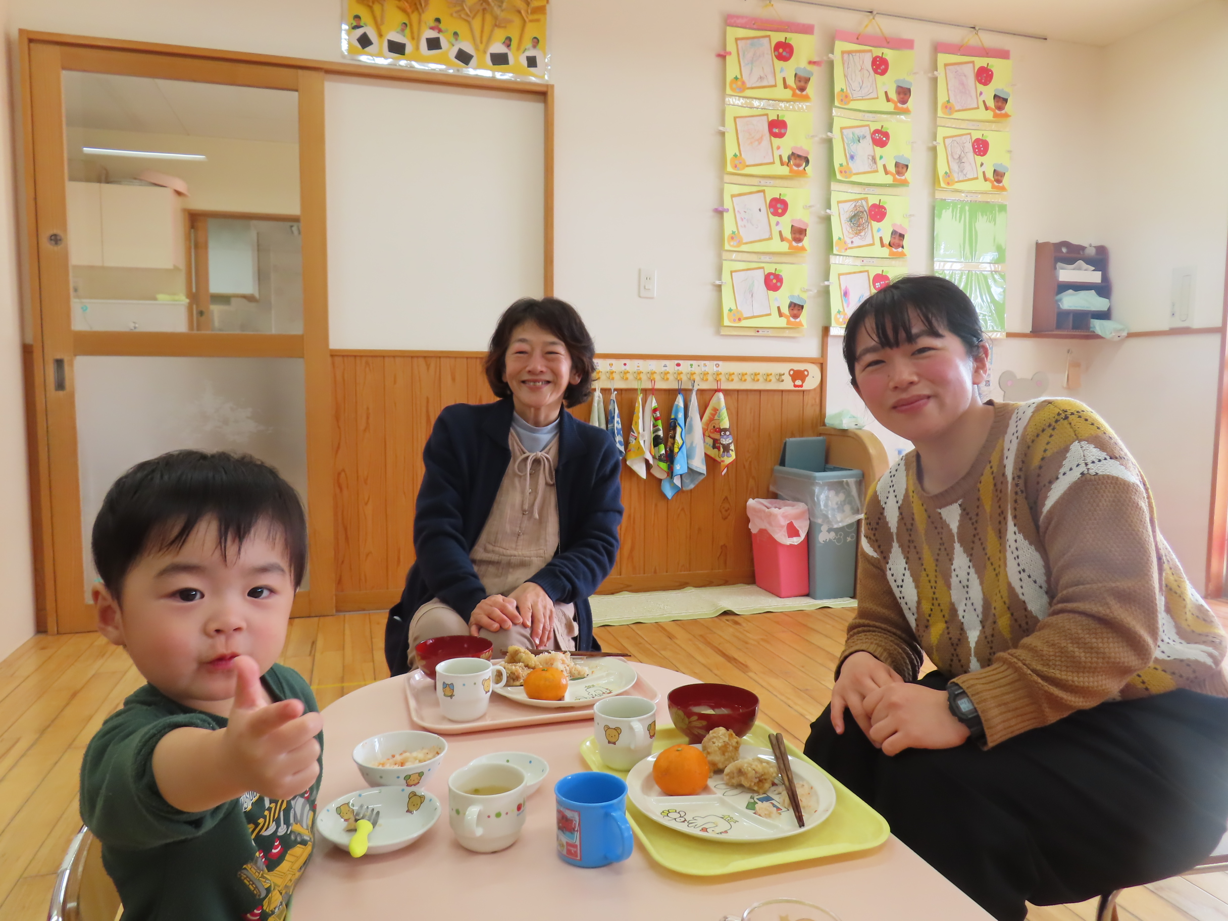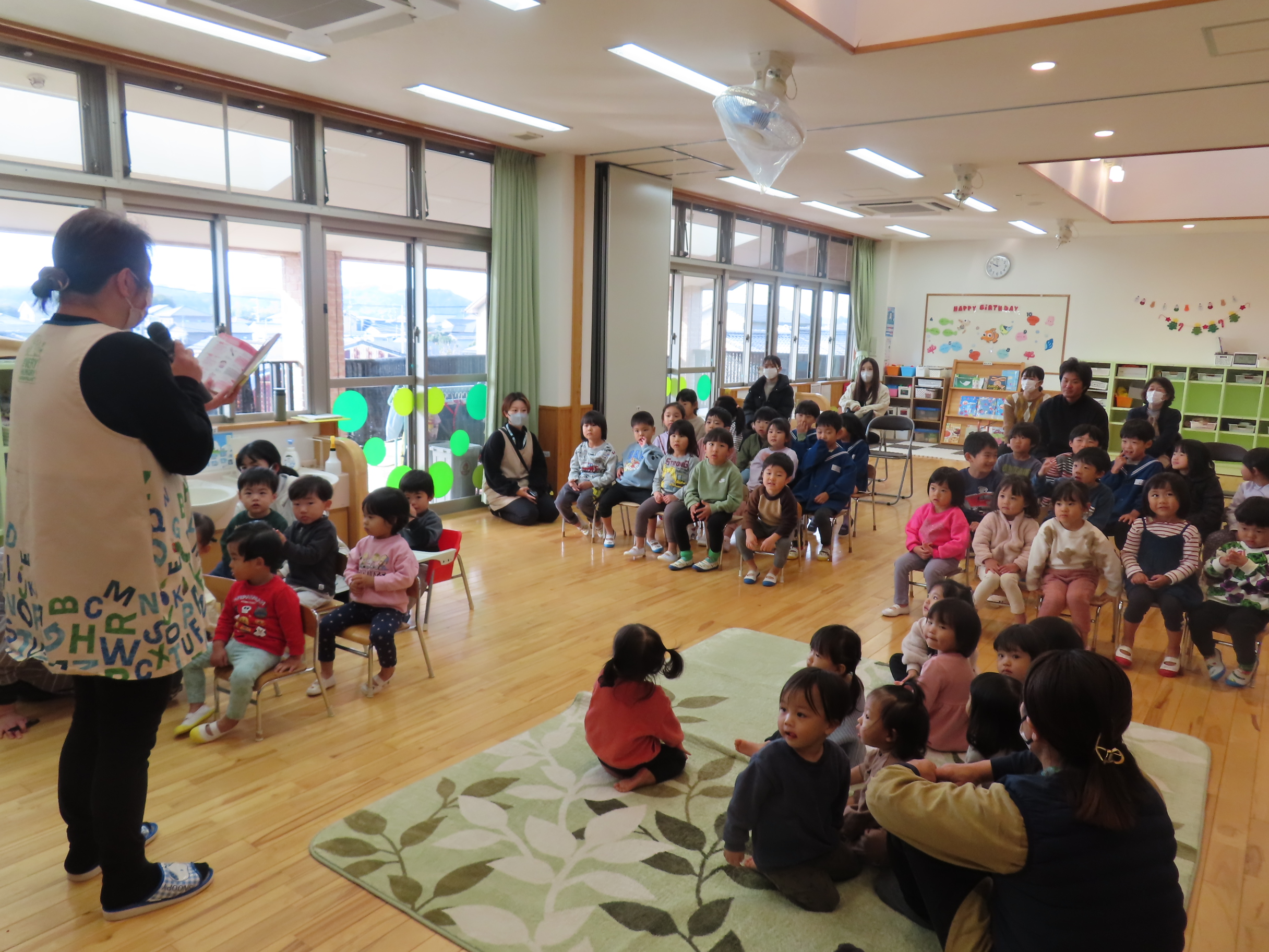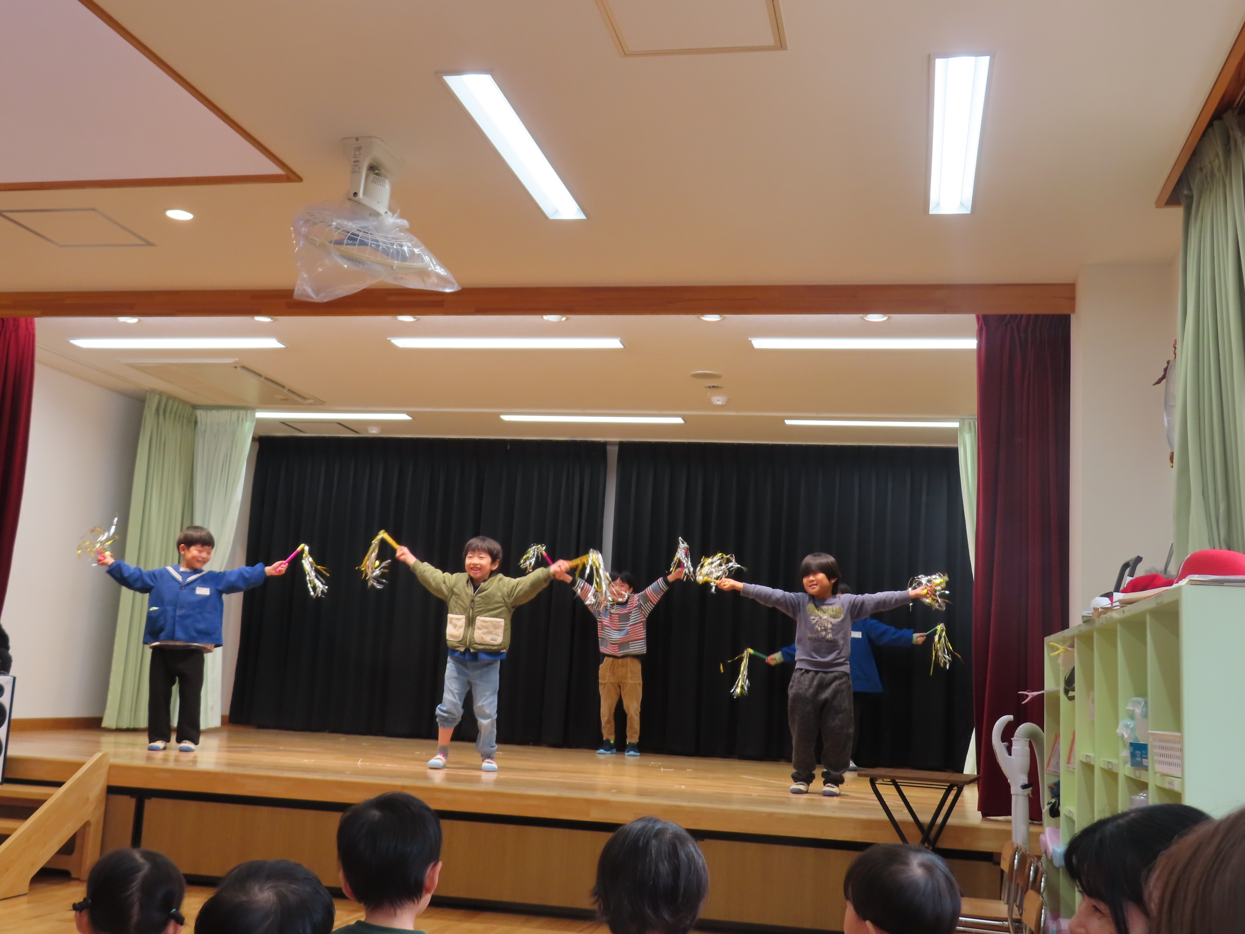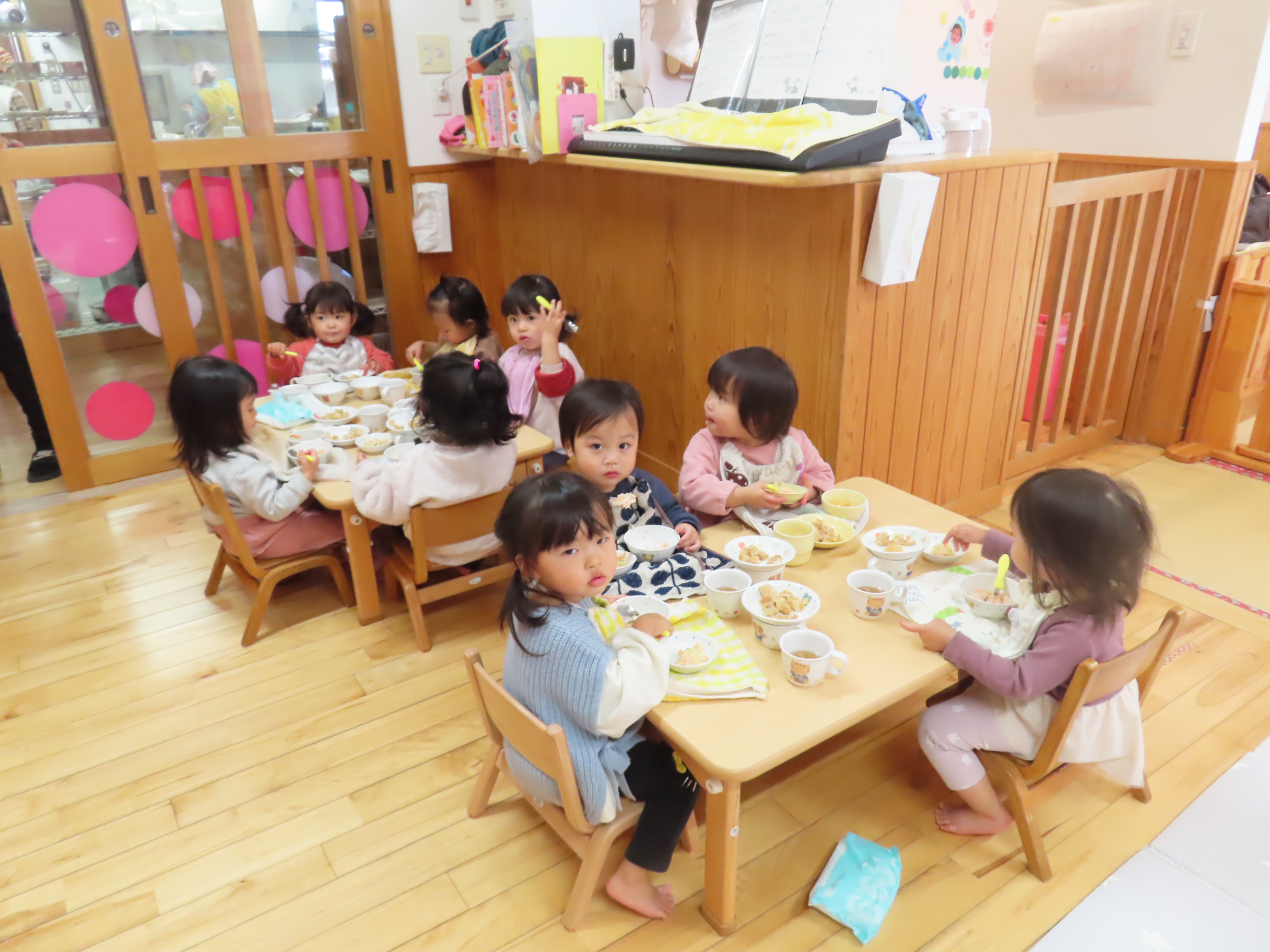 12月生まれの誕生会がありました。質問コーナーでは、12月生まれのお友だちに好きな果物や車を聞きました。みんな大きな声で、「りんご!」「シエンタ」など答えてくれましたよ。出し物では、大型絵本の紙芝居を見て大笑いしたり、発表会で踊った曲をみんなの前で披露したりして楽しく過ごしました。給食もおうちの人と食べれて嬉しそうな12月生まれの子どもたちでした。