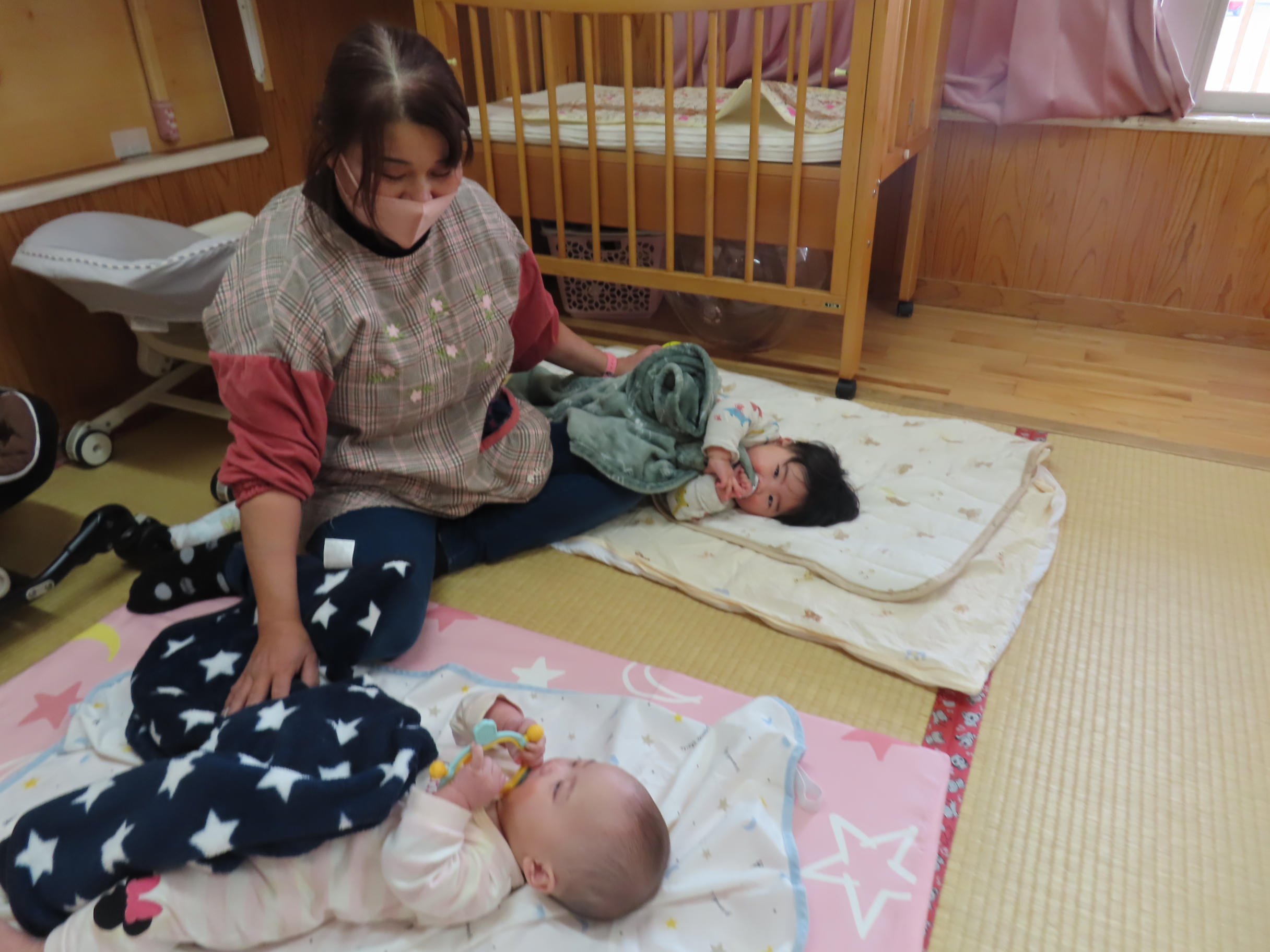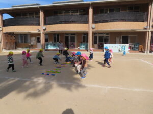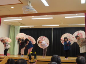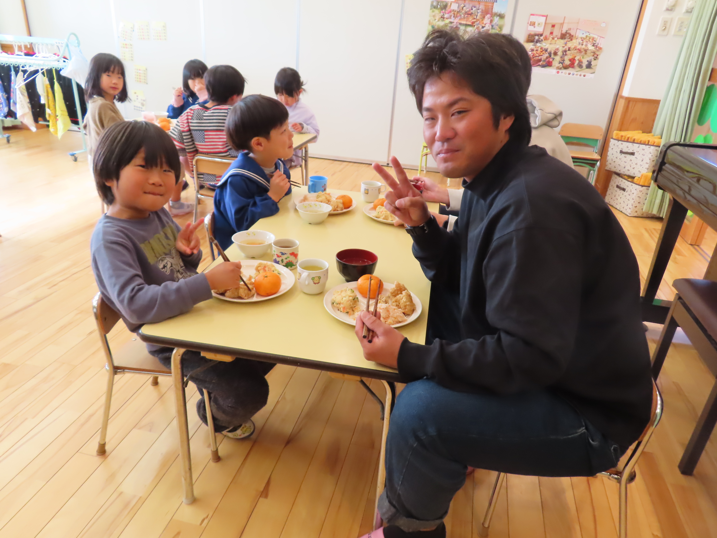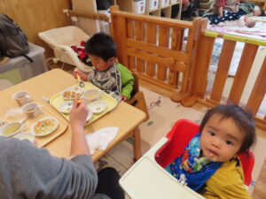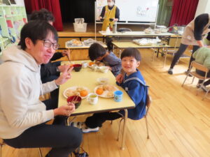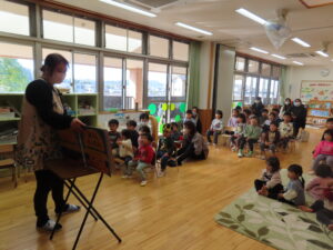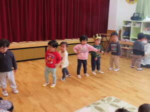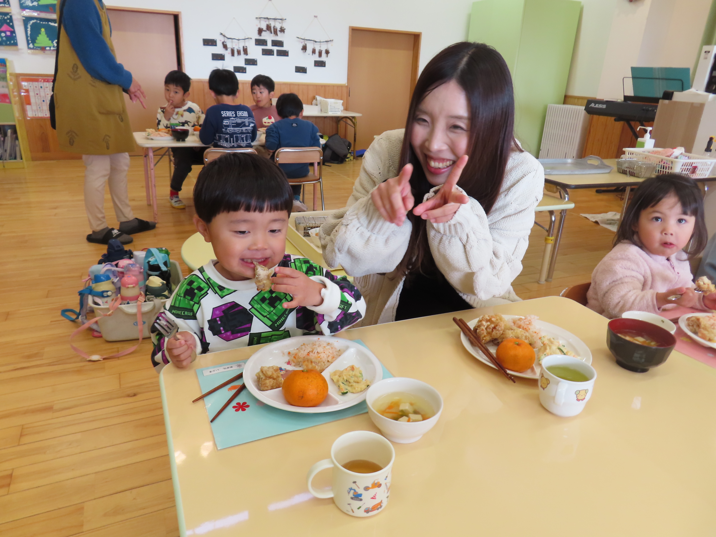 12月生まれの誕生会がありました。質問コーナーでは、12月生まれのお友だちに好きな果物や車を聞きました。みんな大きな声で、「りんご!」「シエンタ」など答えてくれましたよ。出し物では、大型絵本の紙芝居を見て大笑いしたり、発表会で踊った曲をみんなの前で披露したりして楽しく過ごしました。給食もおうちの人と食べれて嬉しそうな12月生まれの子どもたちでした。