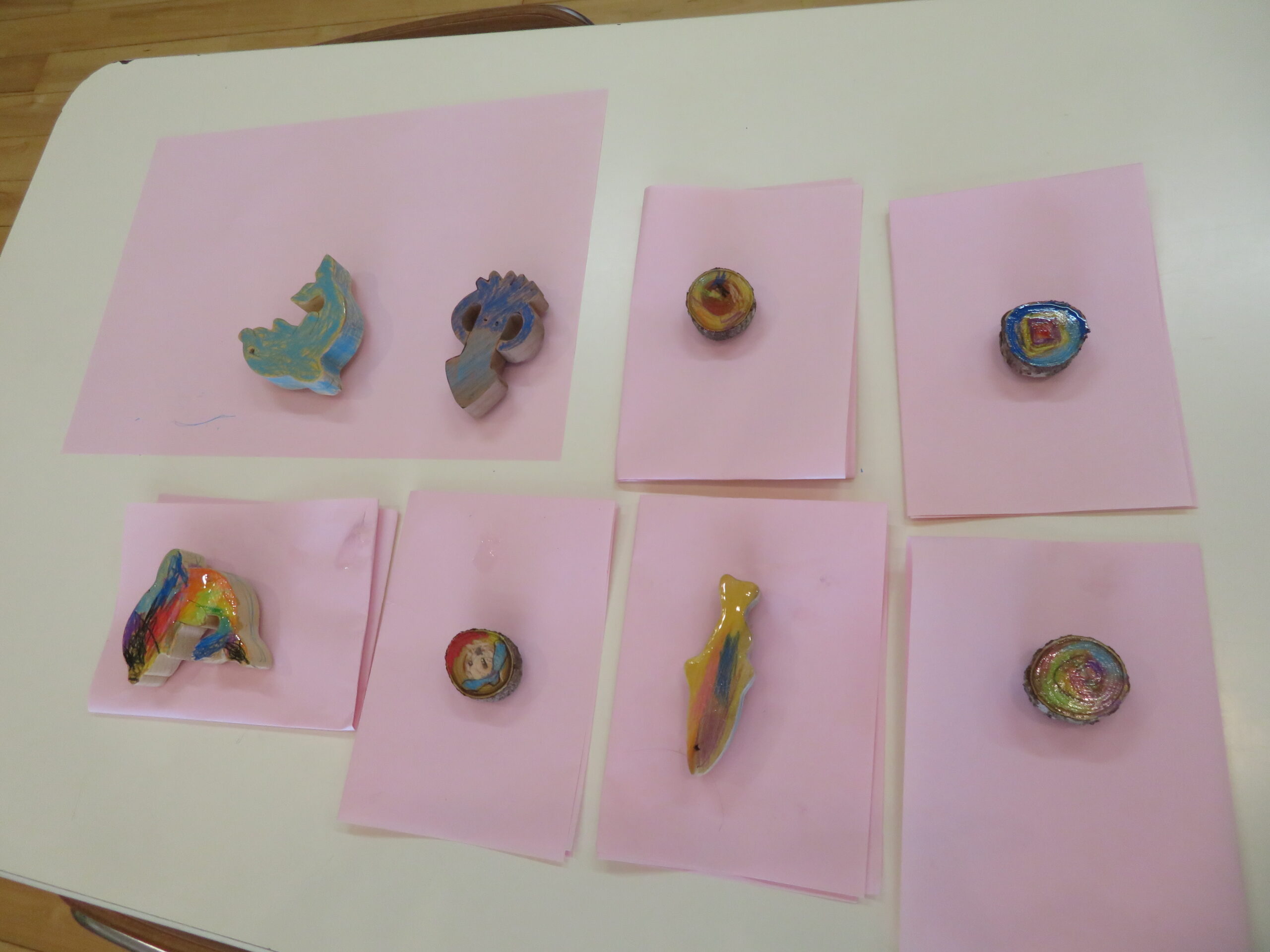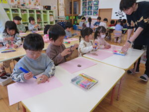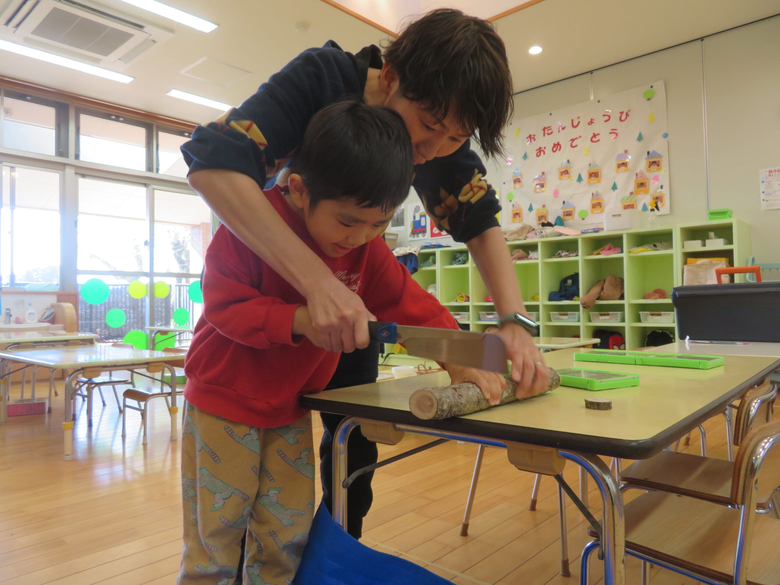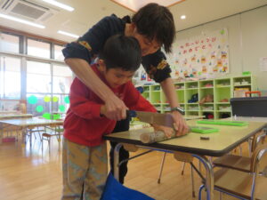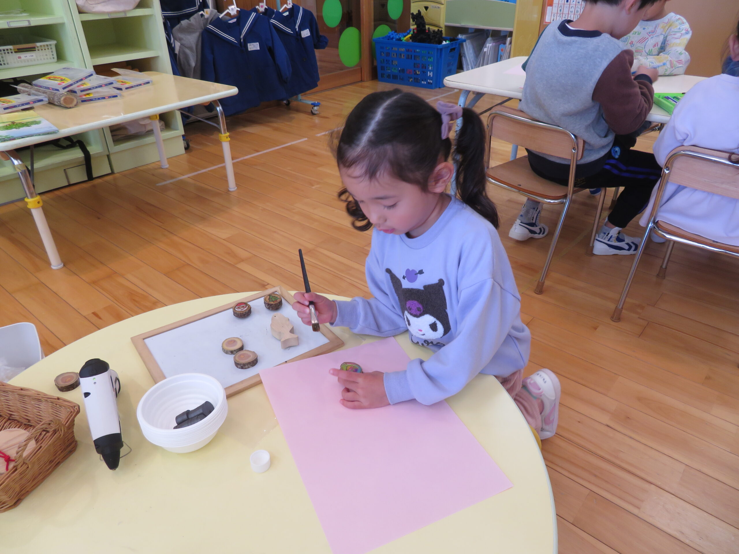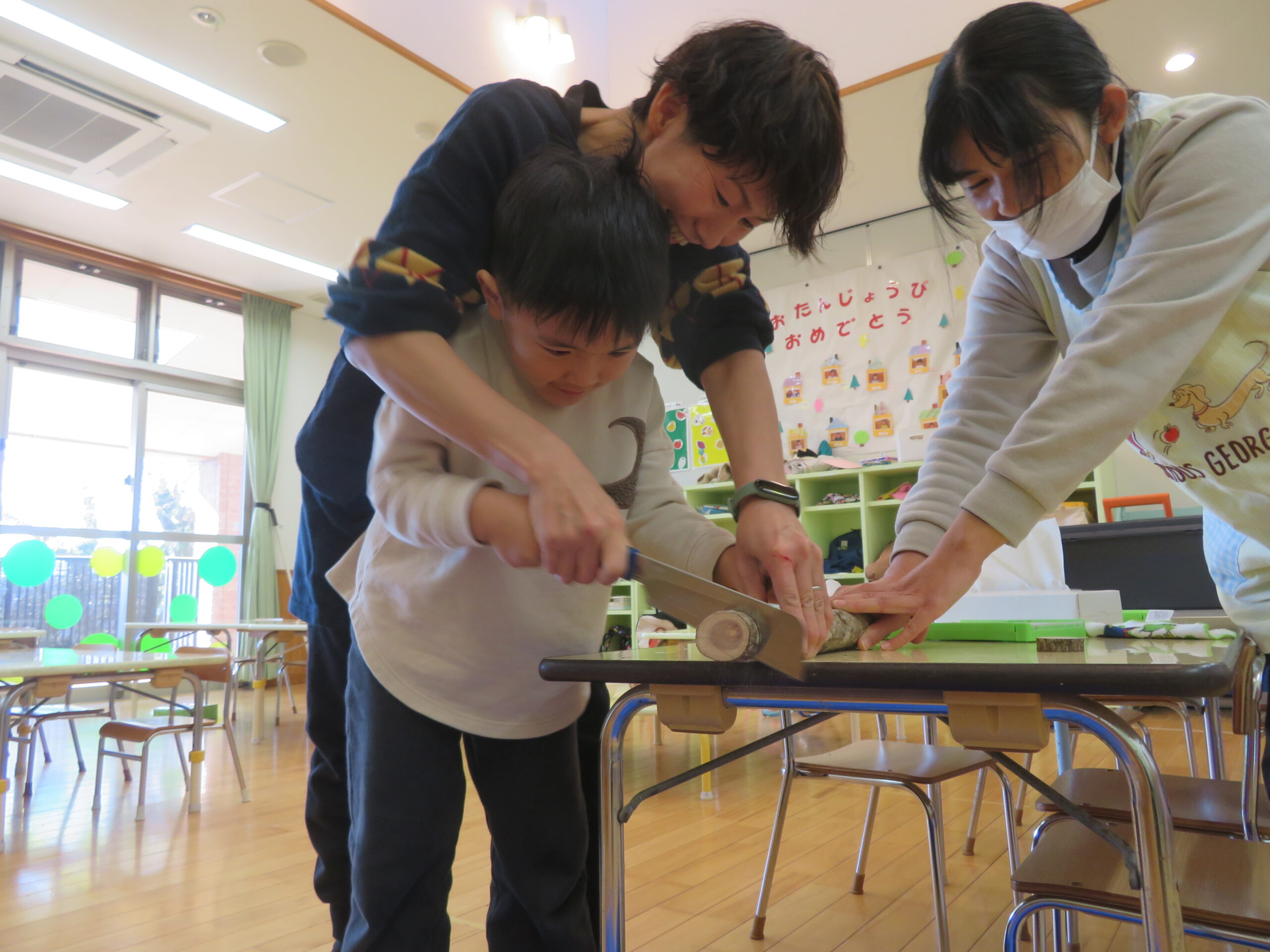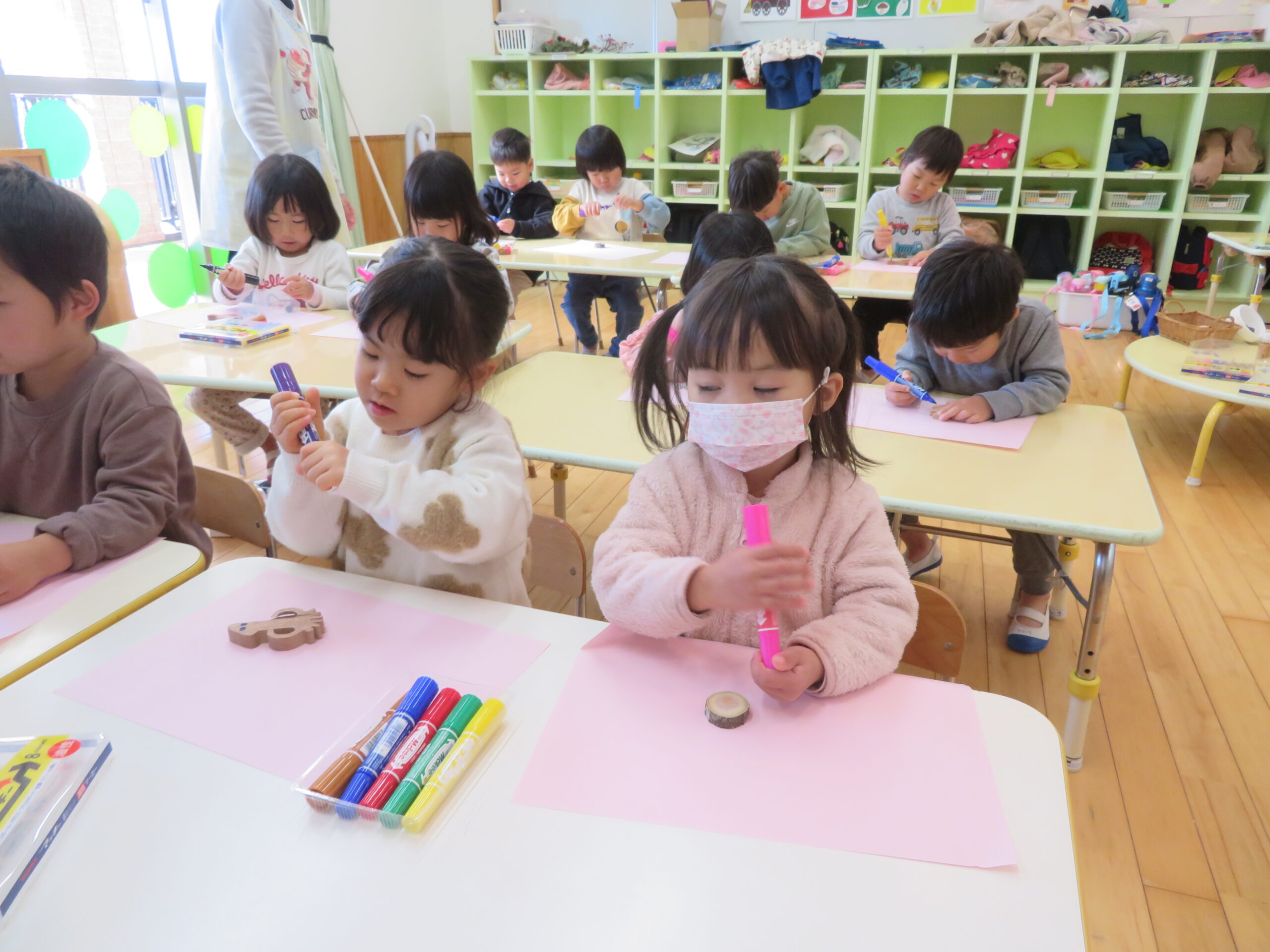 園庭のせんだんの木を切る体験をしました。のこぎりを使って保育者と一緒に木を切った後、木にペンやポンキーで色づけしました。保育者がニスを塗り、磁石をつけてあげると、「かわいい」「持って帰りたい」と嬉しそうな声がたくさん聞かれました。のこぎりで切った木くずを触ってみたり、木のにおいを嗅いでみたりと楽しい木育の時間を過ごした子どもたちでした。
