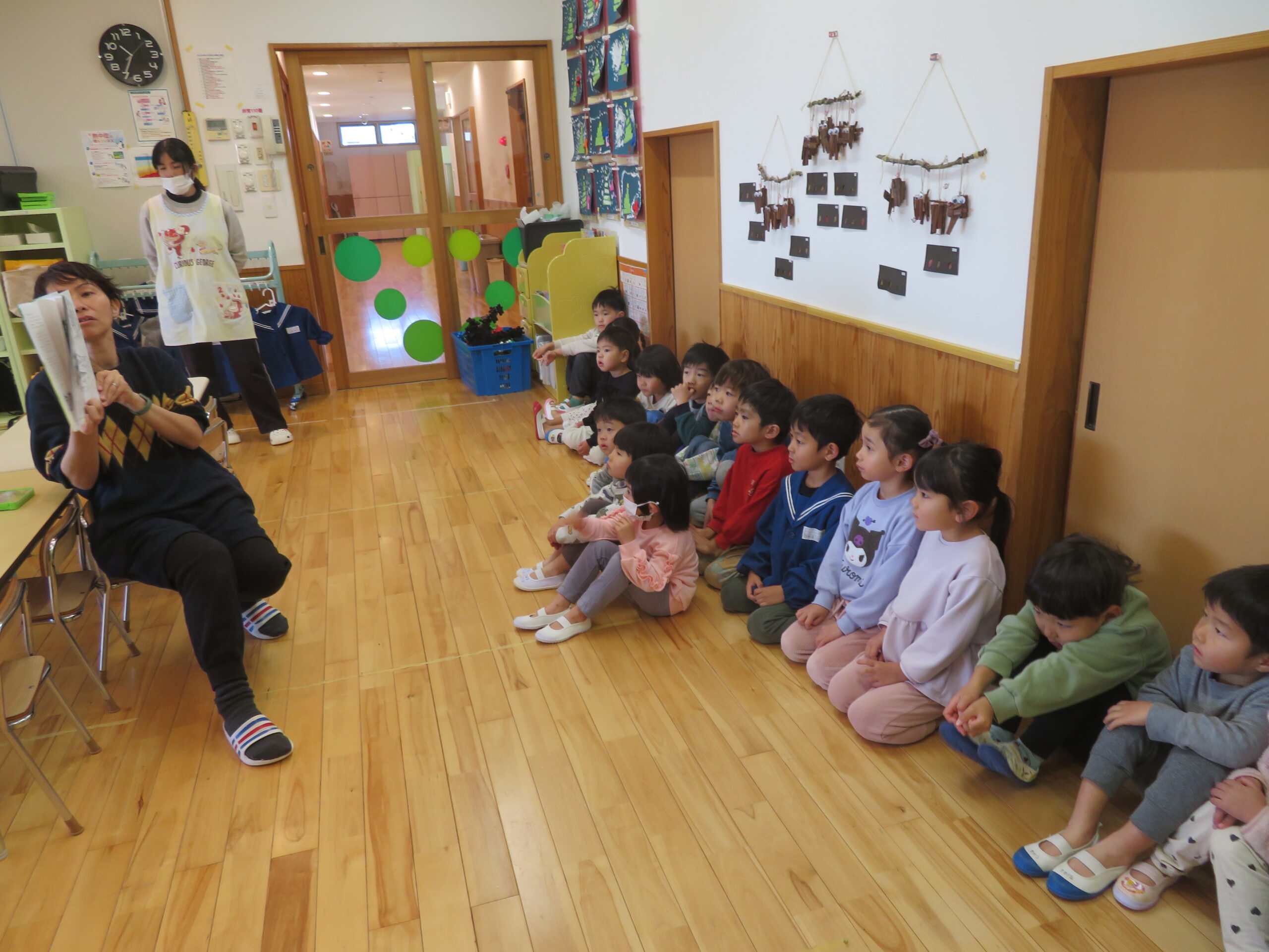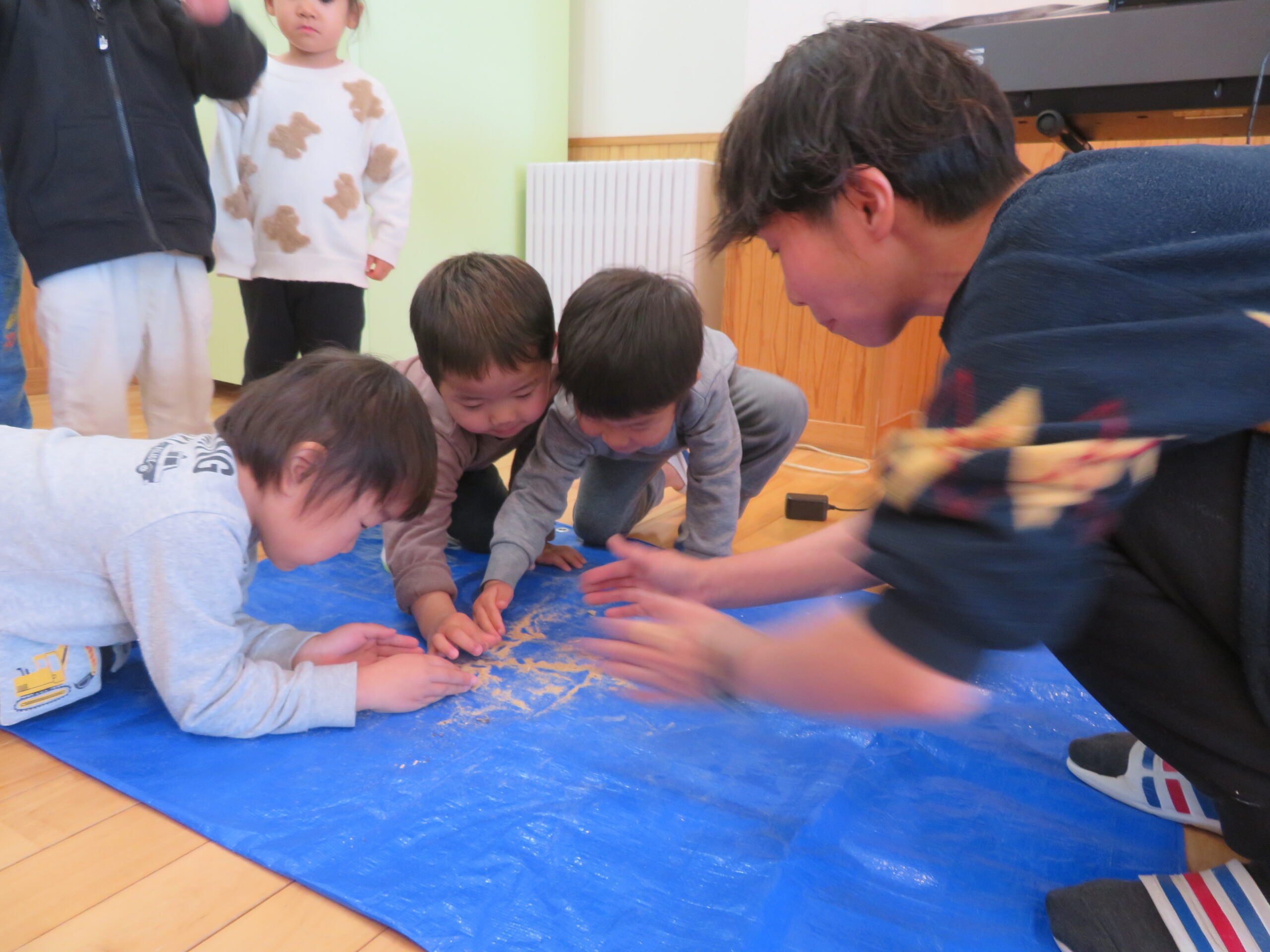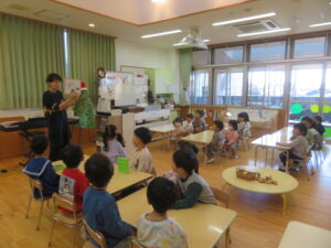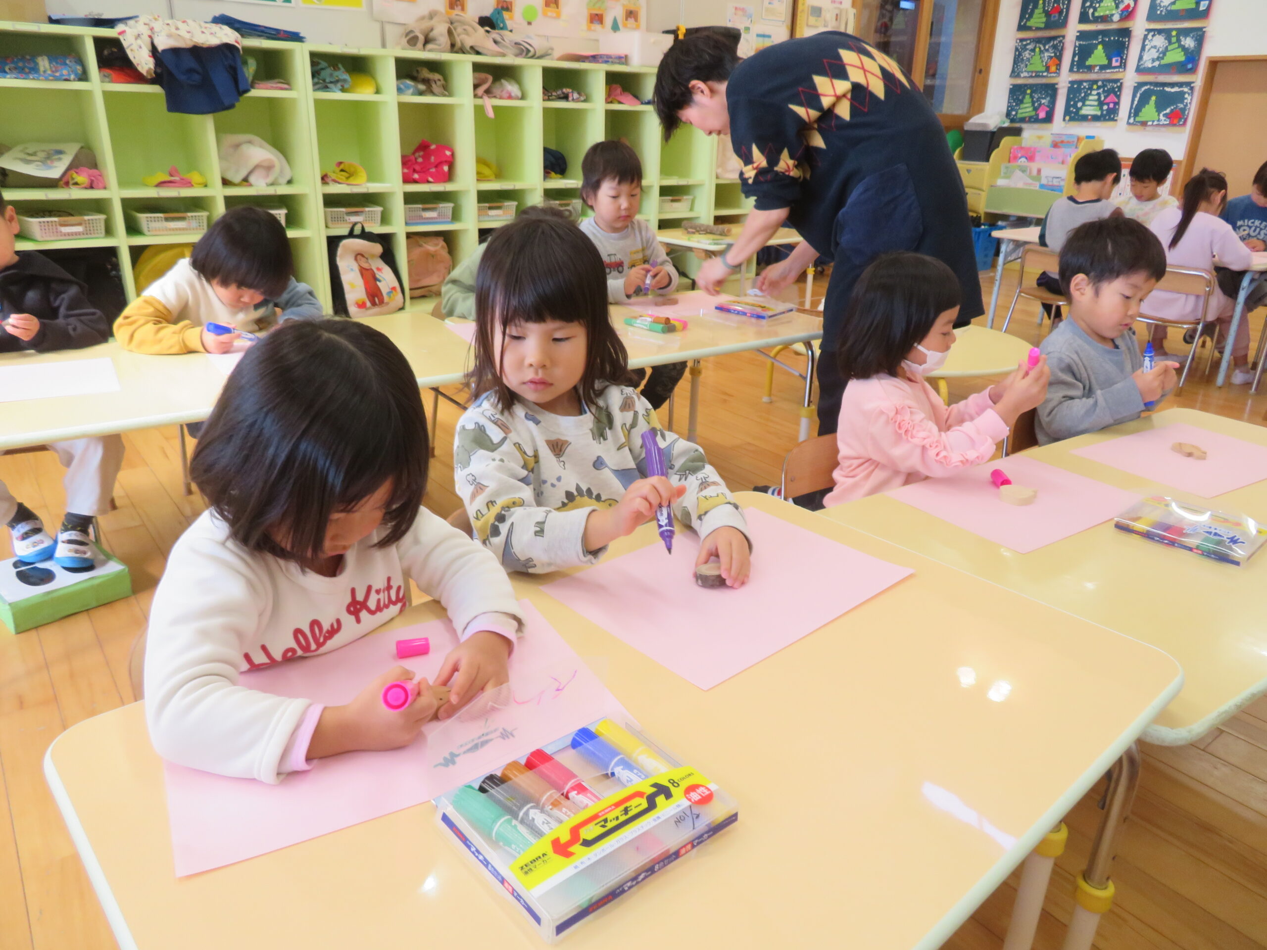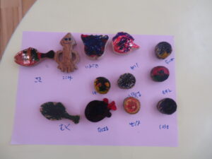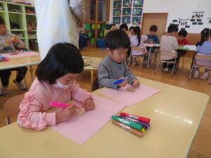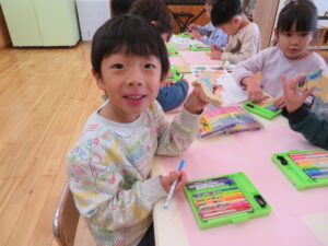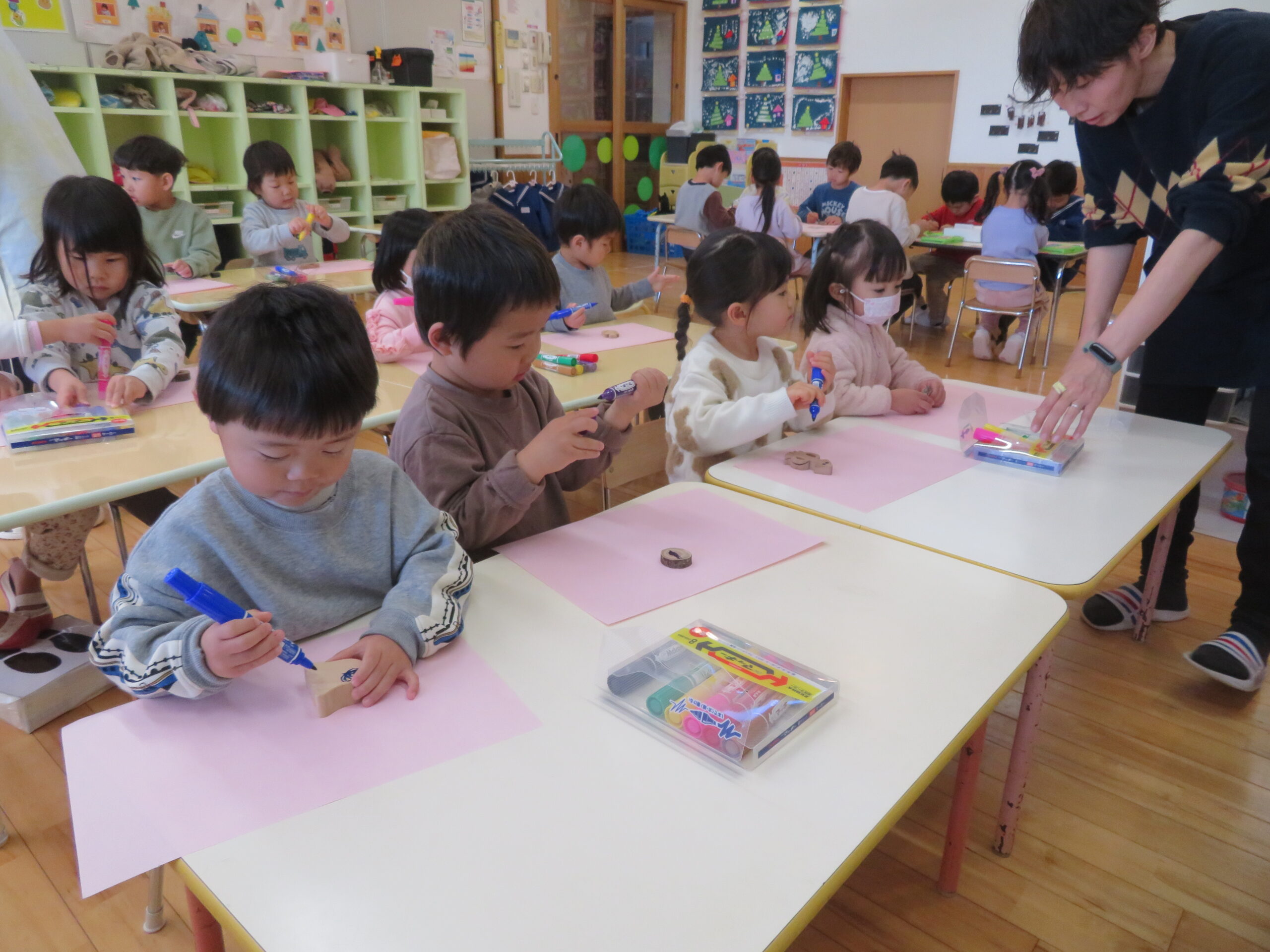 園庭のせんだんの木を切る体験をしました。のこぎりを使って保育者と一緒に木を切った後、木にペンやポンキーで色づけしました。保育者がニスを塗り、磁石をつけてあげると、「かわいい」「持って帰りたい」と嬉しそうな声がたくさん聞かれました。のこぎりで切った木くずを触ってみたり、木のにおいを嗅いでみたりと楽しい木育の時間を過ごした子どもたちでした。
