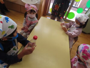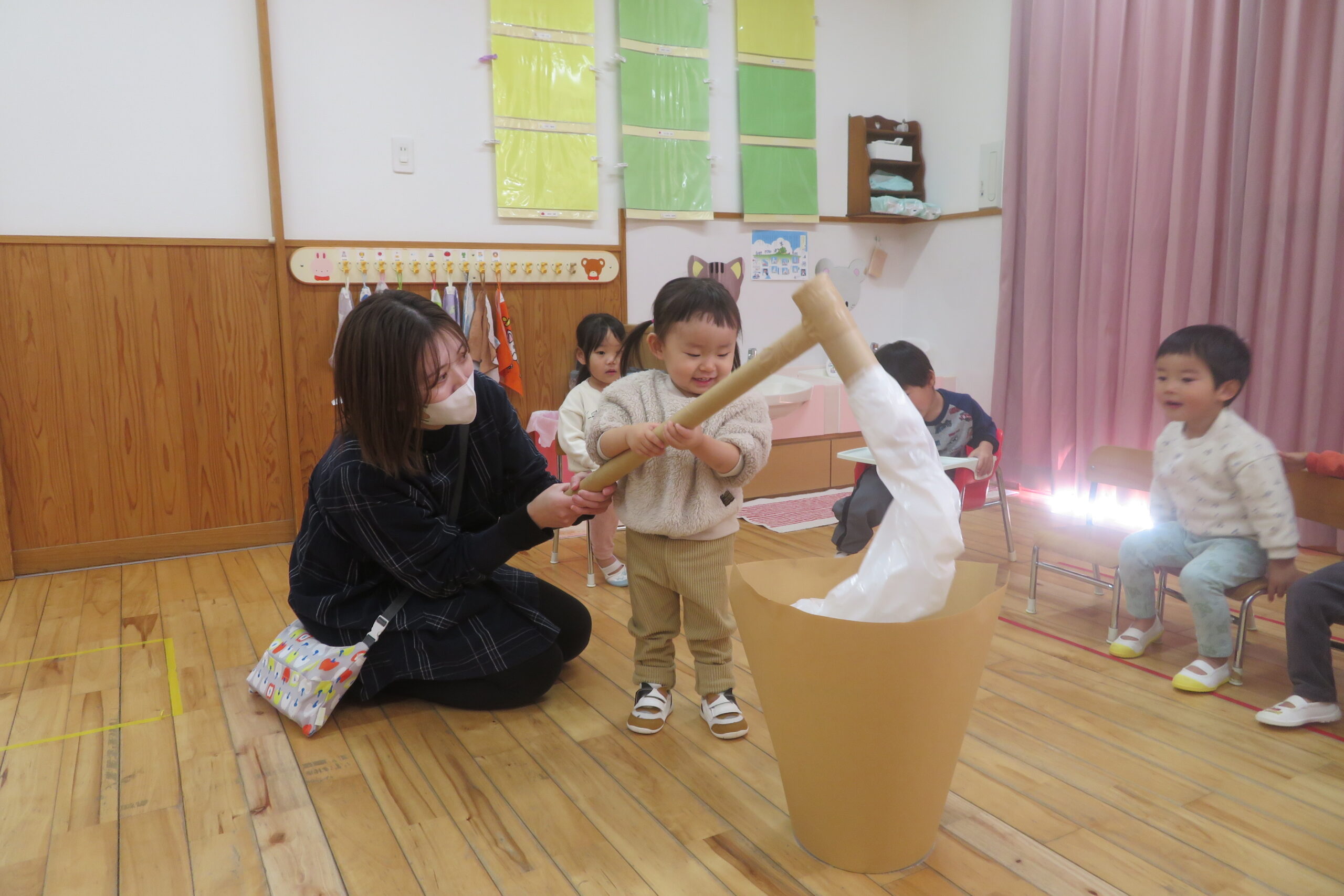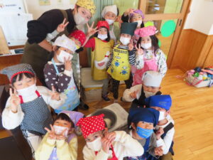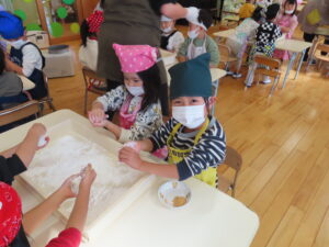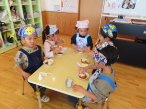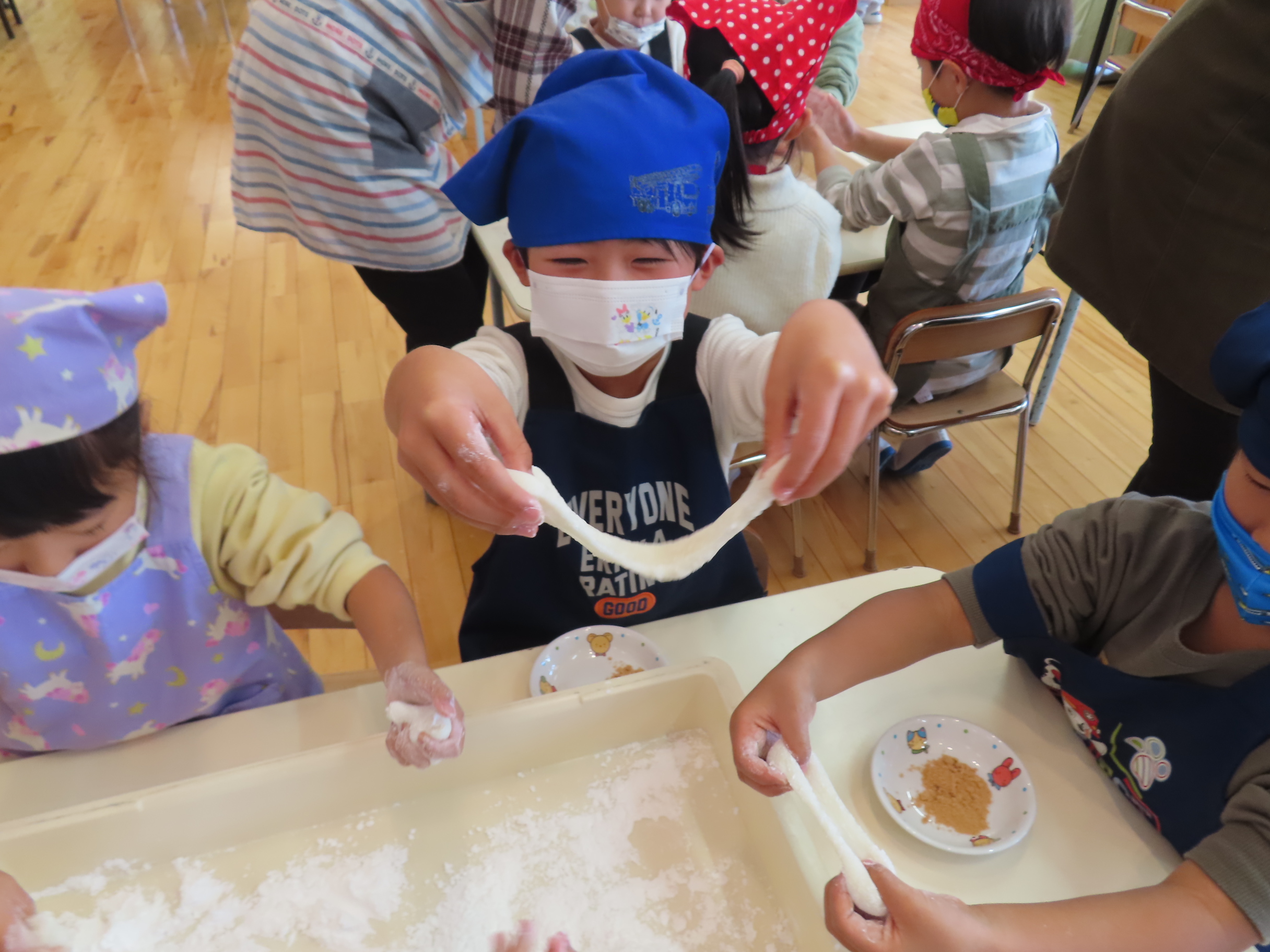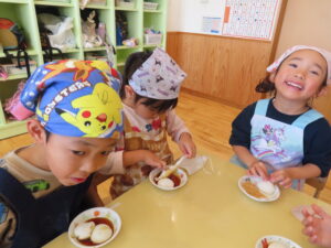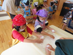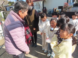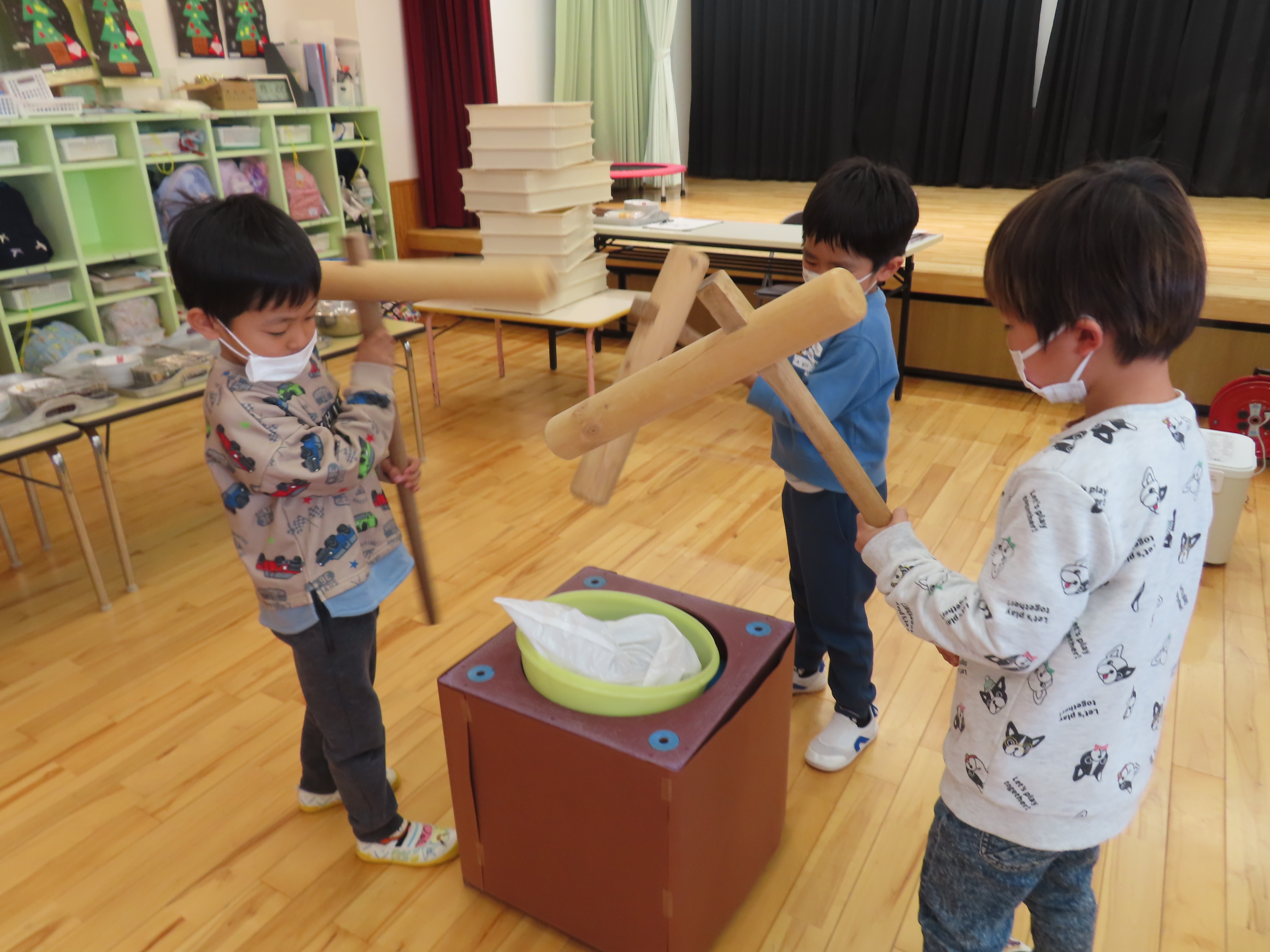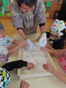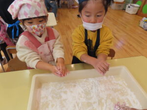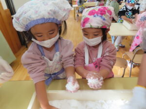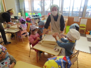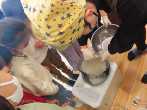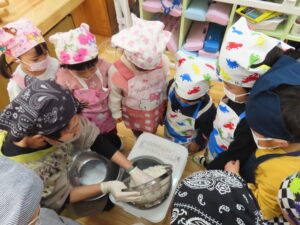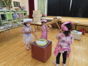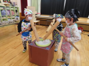 今日は餅つきを行いました。お米ともち米を比べてみたり、保育者が作った臼とおもちに見立てた物を杵でついてみたり、昔ながらのお餅つきも体験しました。お米がだんだんお餅にかわっていく様子をじっーと見つめる子ども達。つきあがると「わぁ~」と歓声があがり、やわらかい感触を味わいながら丁寧に丸めていました。自分で丸めたお餅を、砂糖醬油やきなこをつけて食べました。「おいしい!!」と大満足でした。ひまわり組さんで、近所の方に一年の感謝の気持ちを込めてお餅をプレゼントしました。
