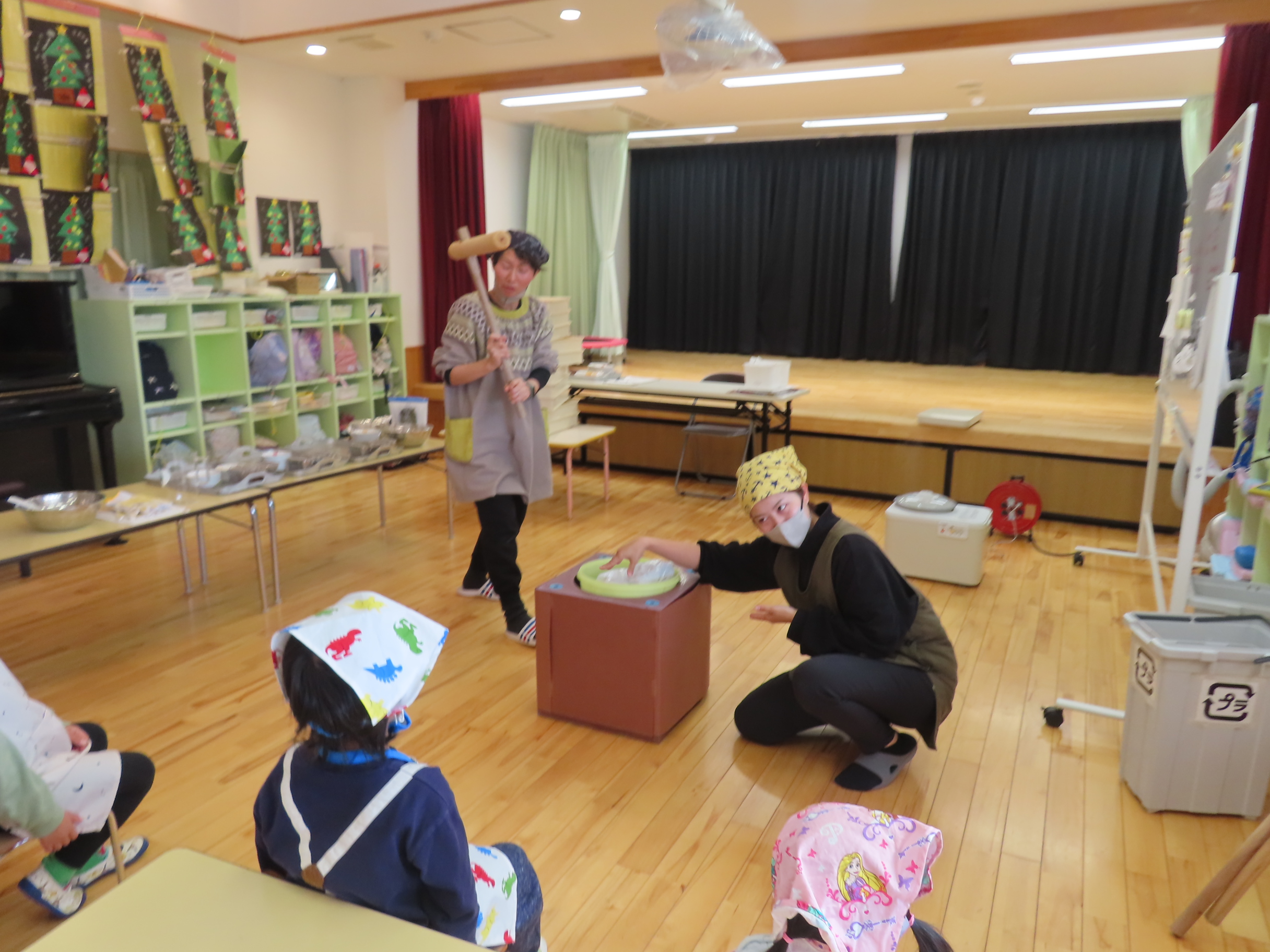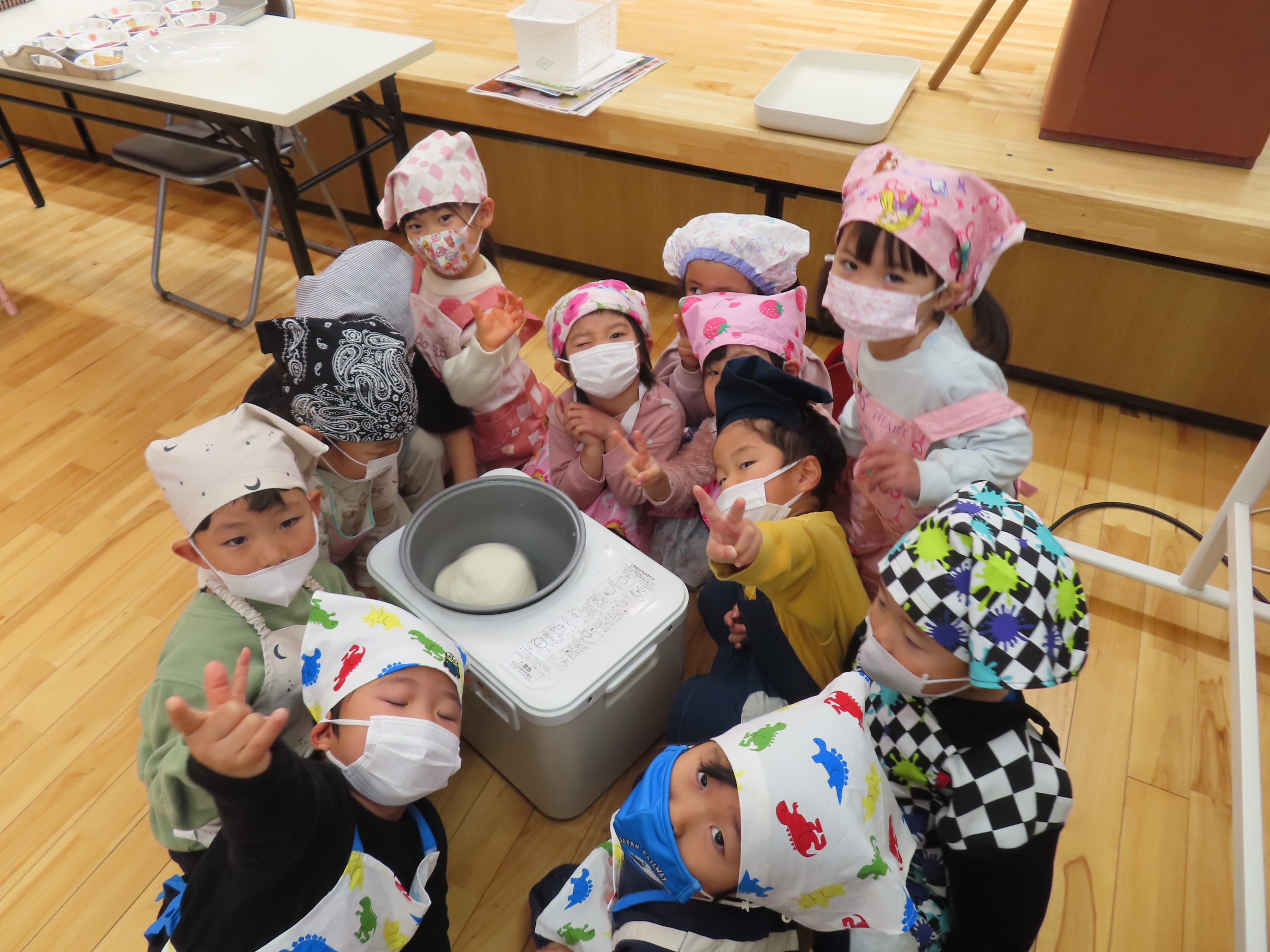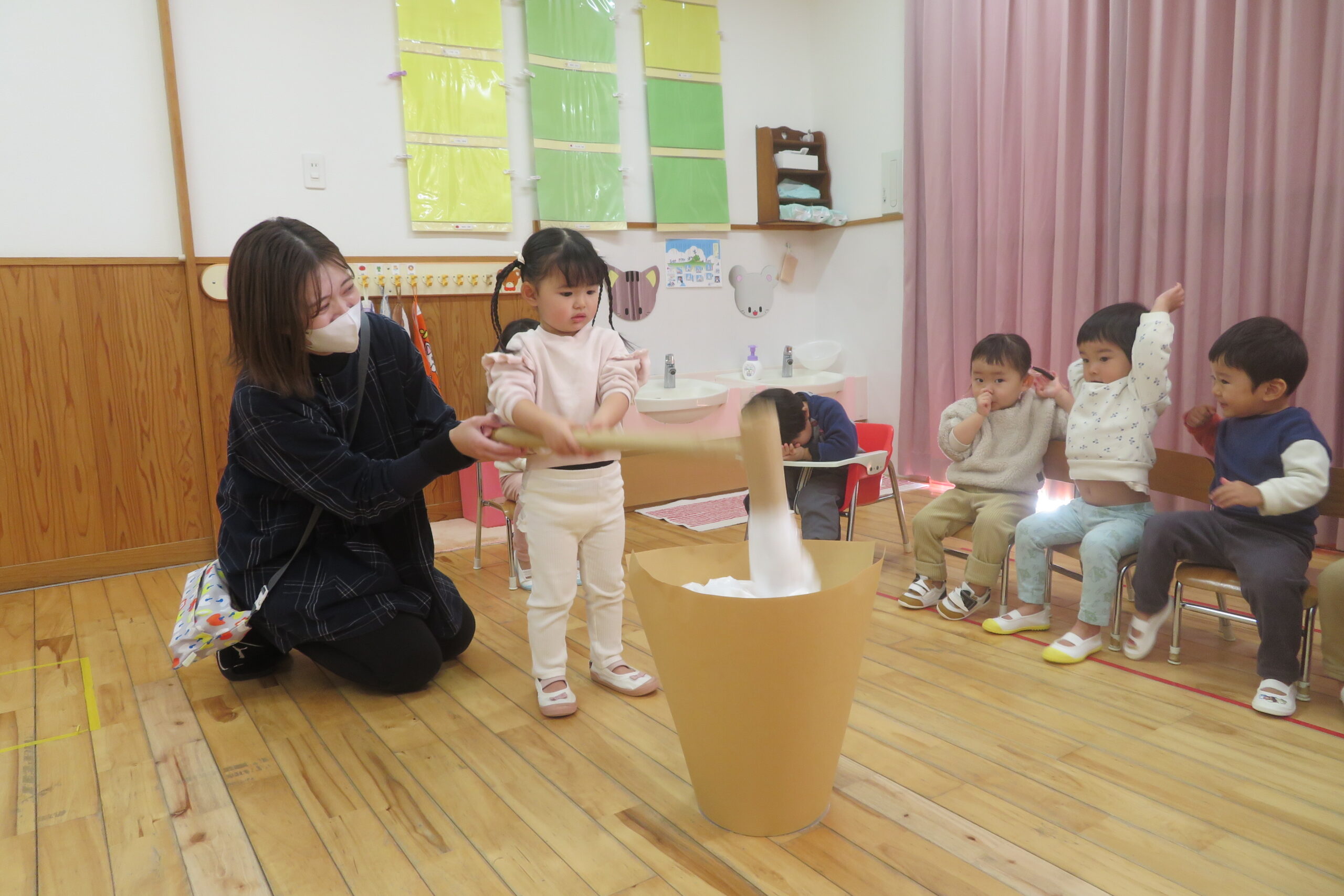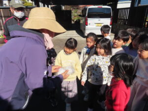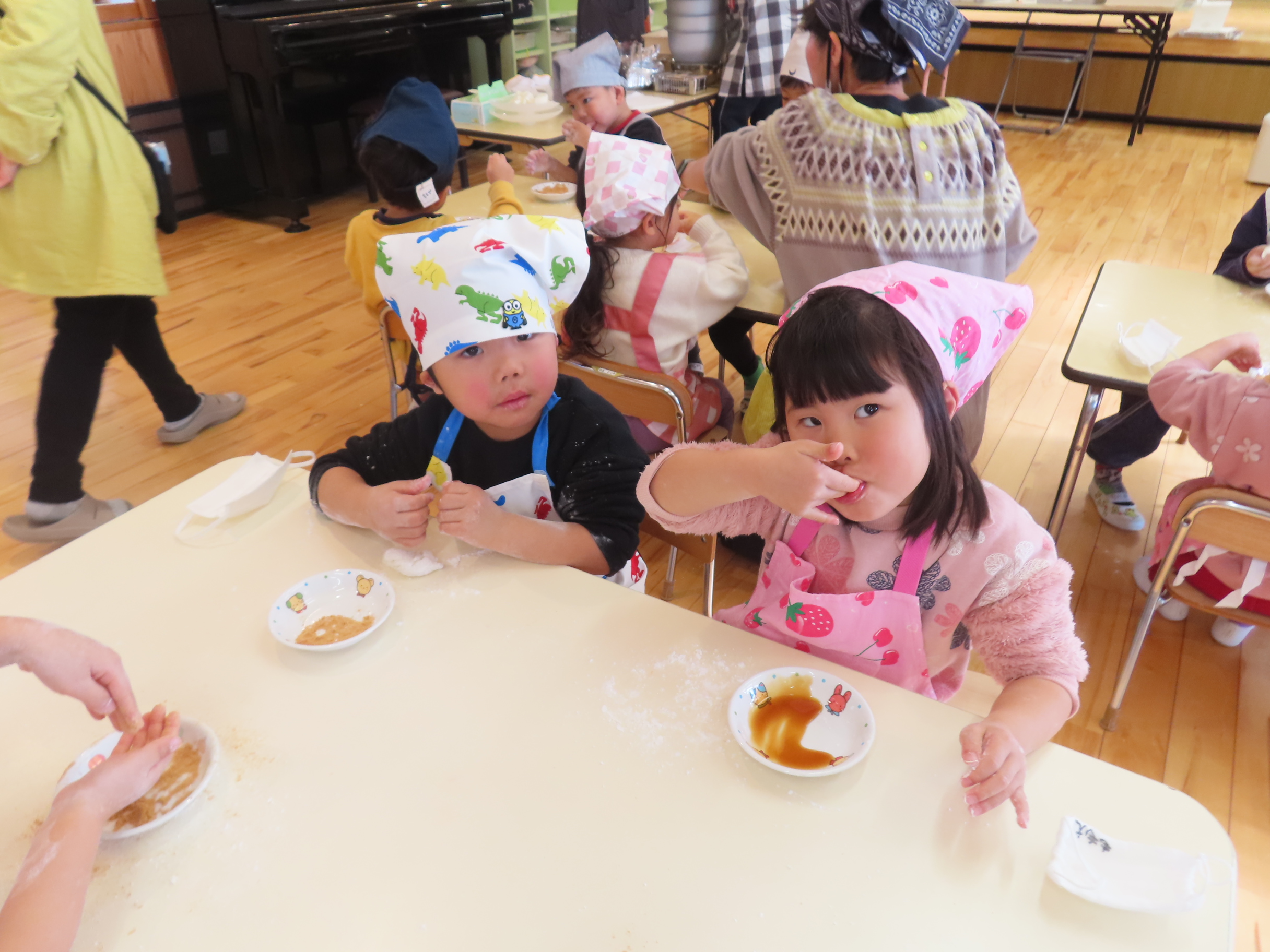 今日は餅つきを行いました。お米ともち米を比べてみたり、保育者が作った臼とおもちに見立てた物を杵でついてみたり、昔ながらのお餅つきも体験しました。お米がだんだんお餅にかわっていく様子をじっーと見つめる子ども達。つきあがると「わぁ~」と歓声があがり、やわらかい感触を味わいながら丁寧に丸めていました。自分で丸めたお餅を、砂糖醬油やきなこをつけて食べました。「おいしい!!」と大満足でした。ひまわり組さんで、近所の方に一年の感謝の気持ちを込めてお餅をプレゼントしました。
