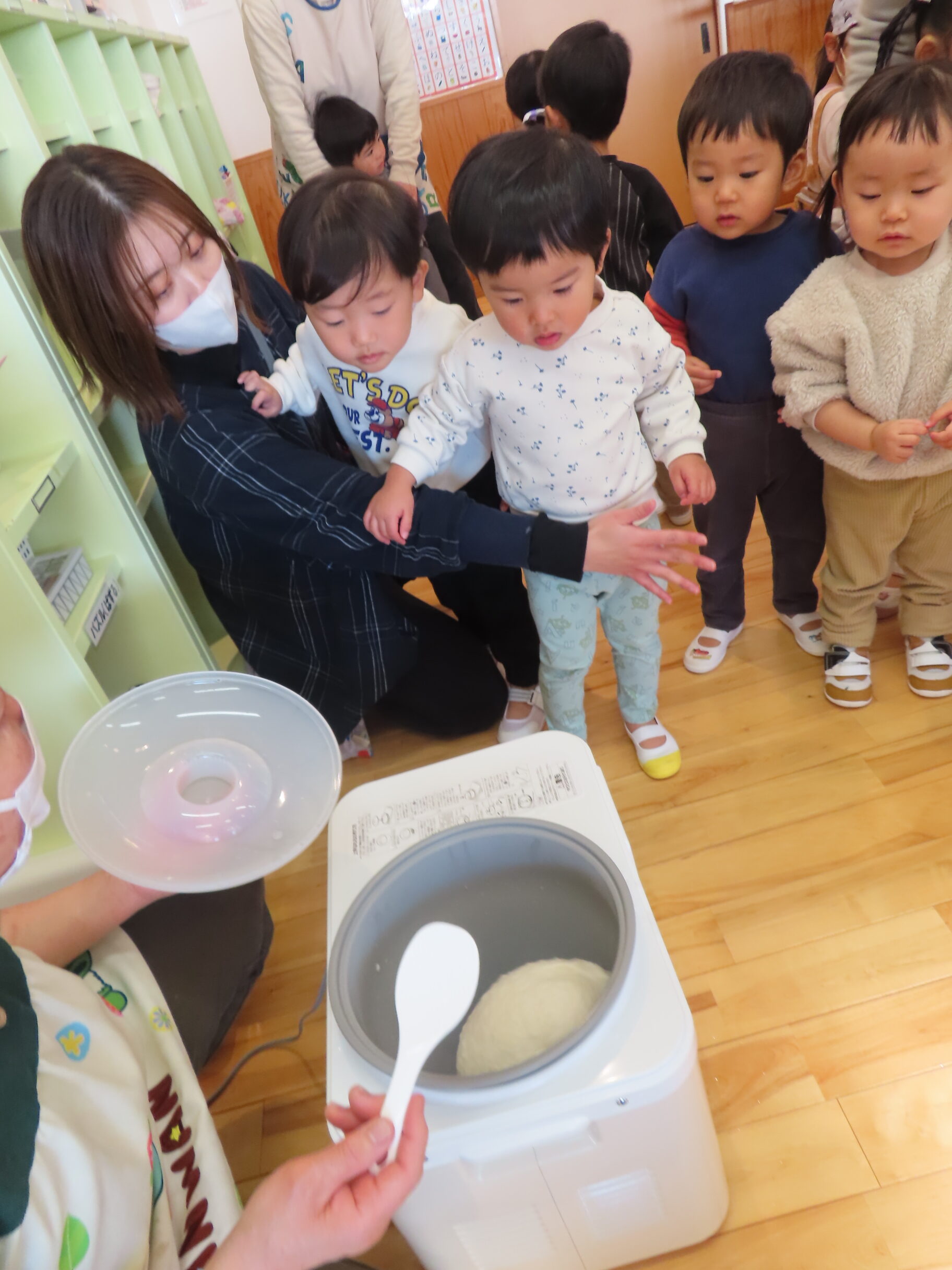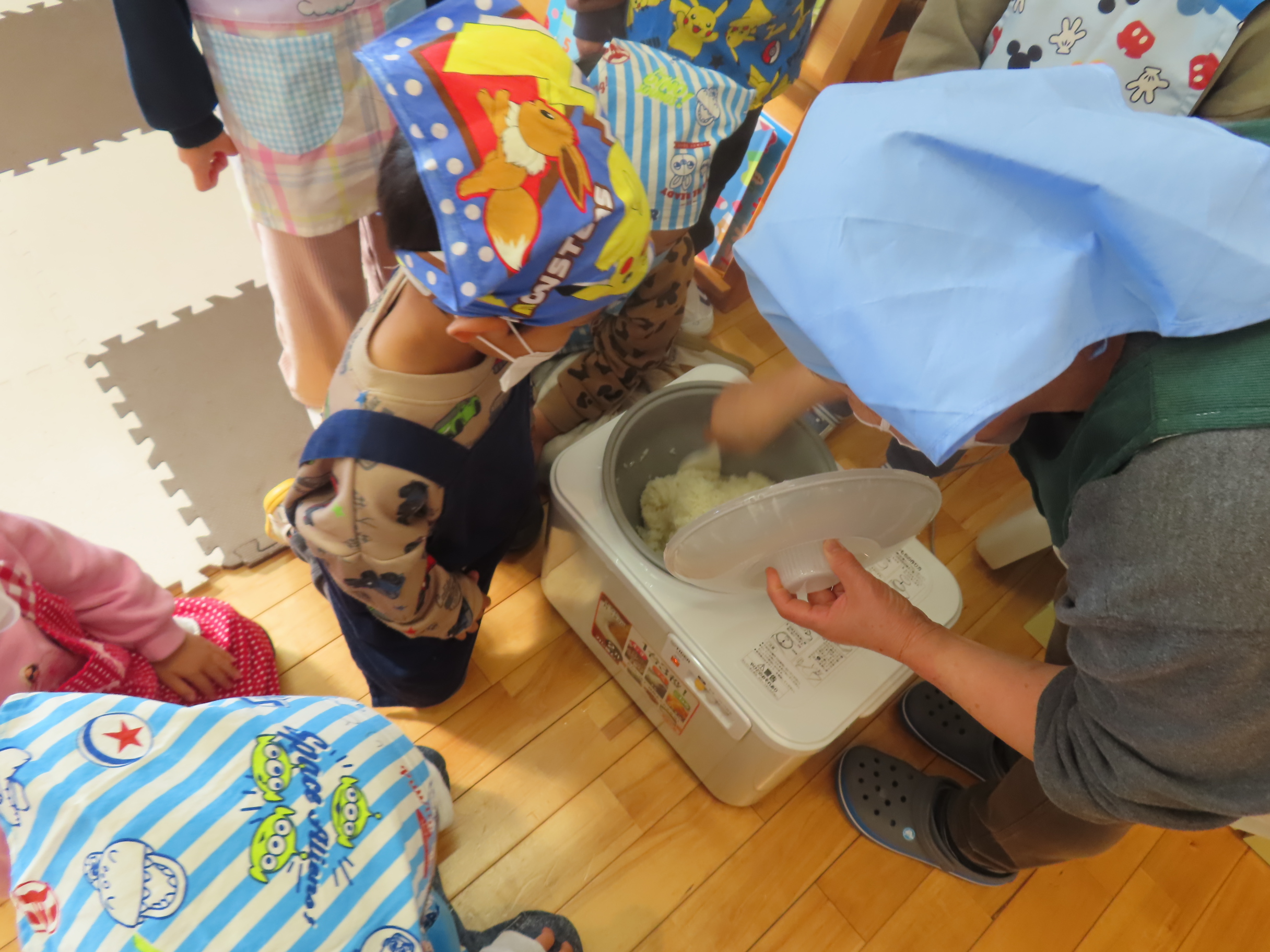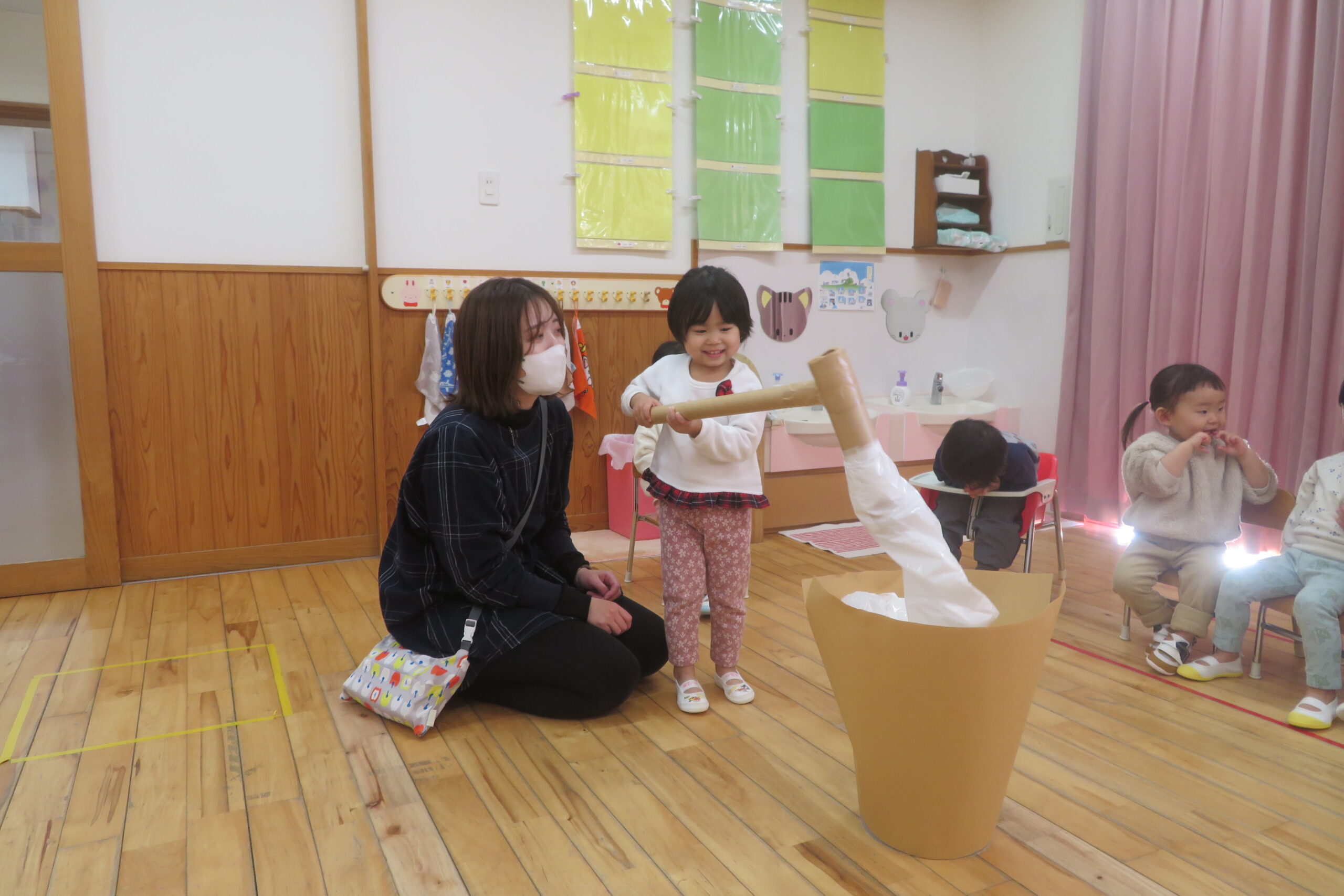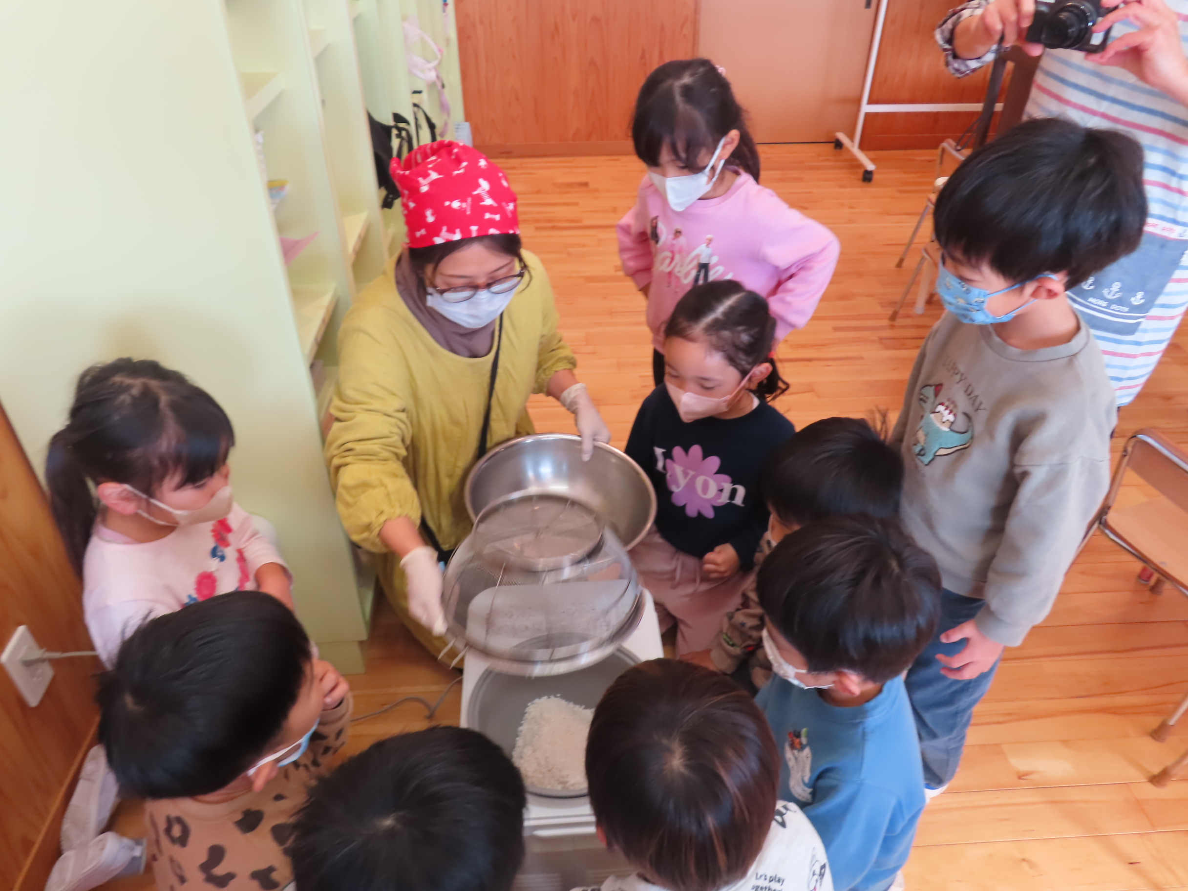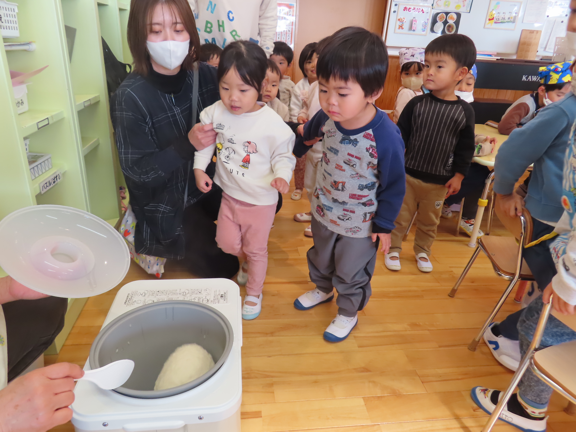 今日は餅つきを行いました。お米ともち米を比べてみたり、保育者が作った臼とおもちに見立てた物を杵でついてみたり、昔ながらのお餅つきも体験しました。お米がだんだんお餅にかわっていく様子をじっーと見つめる子ども達。つきあがると「わぁ~」と歓声があがり、やわらかい感触を味わいながら丁寧に丸めていました。自分で丸めたお餅を、砂糖醬油やきなこをつけて食べました。「おいしい!!」と大満足でした。ひまわり組さんで、近所の方に一年の感謝の気持ちを込めてお餅をプレゼントしました。