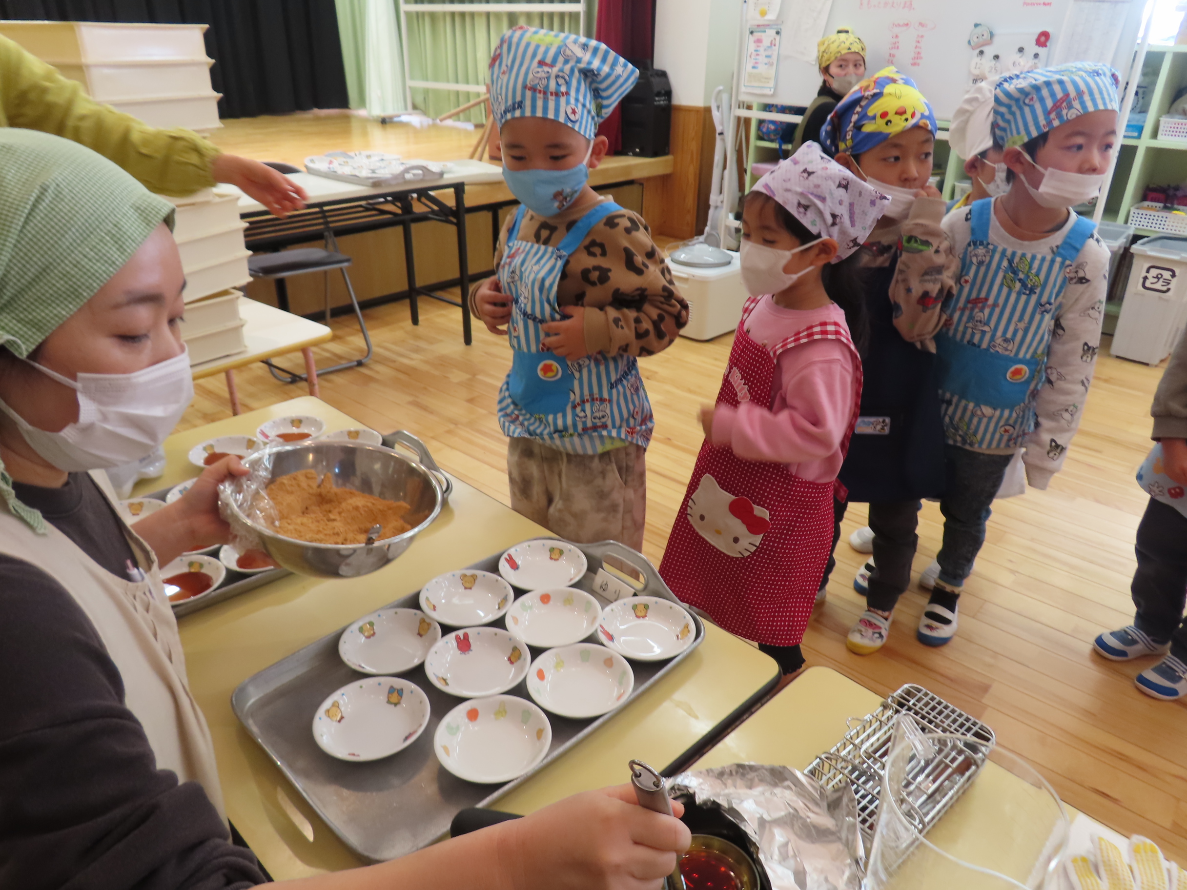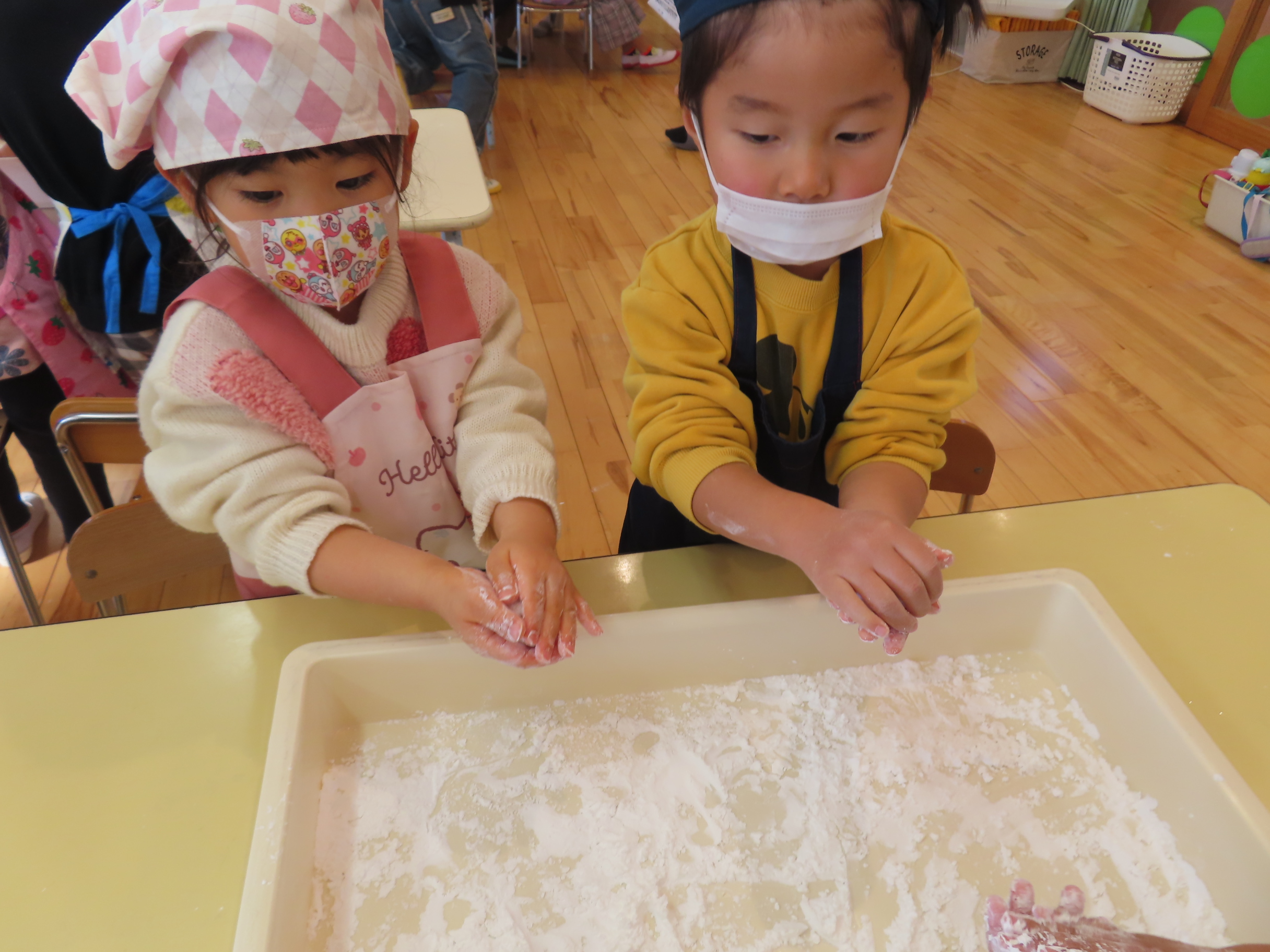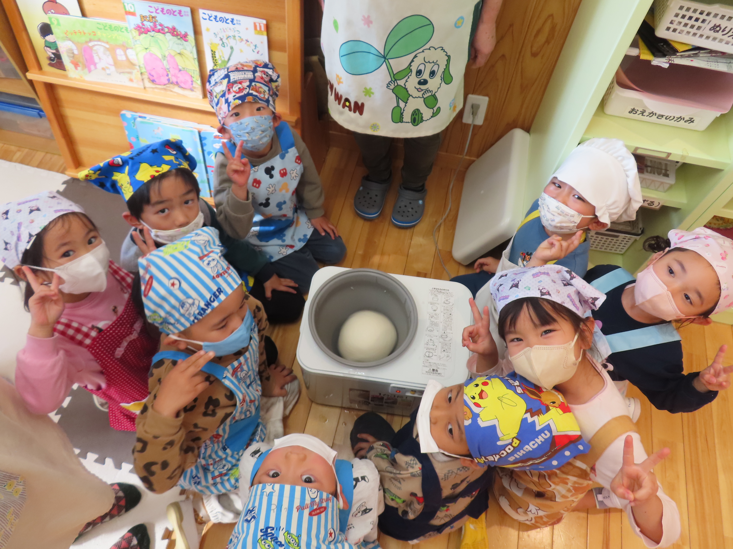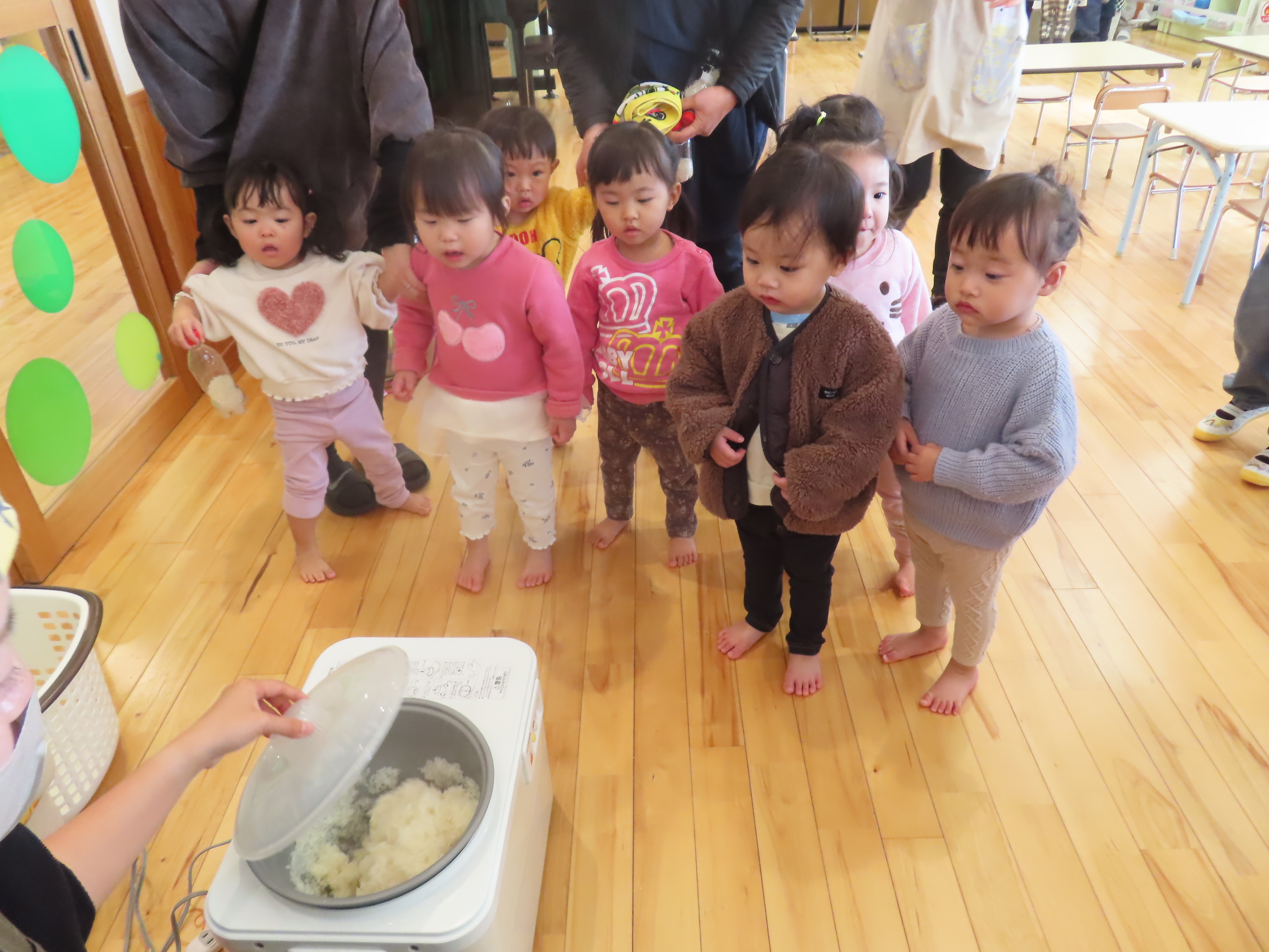 今日は餅つきを行いました。お米ともち米を比べてみたり、保育者が作った臼とおもちに見立てた物を杵でついてみたり、昔ながらのお餅つきも体験しました。お米がだんだんお餅にかわっていく様子をじっーと見つめる子ども達。つきあがると「わぁ~」と歓声があがり、やわらかい感触を味わいながら丁寧に丸めていました。自分で丸めたお餅を、砂糖醬油やきなこをつけて食べました。「おいしい!!」と大満足でした。ひまわり組さんで、近所の方に一年の感謝の気持ちを込めてお餅をプレゼントしました。