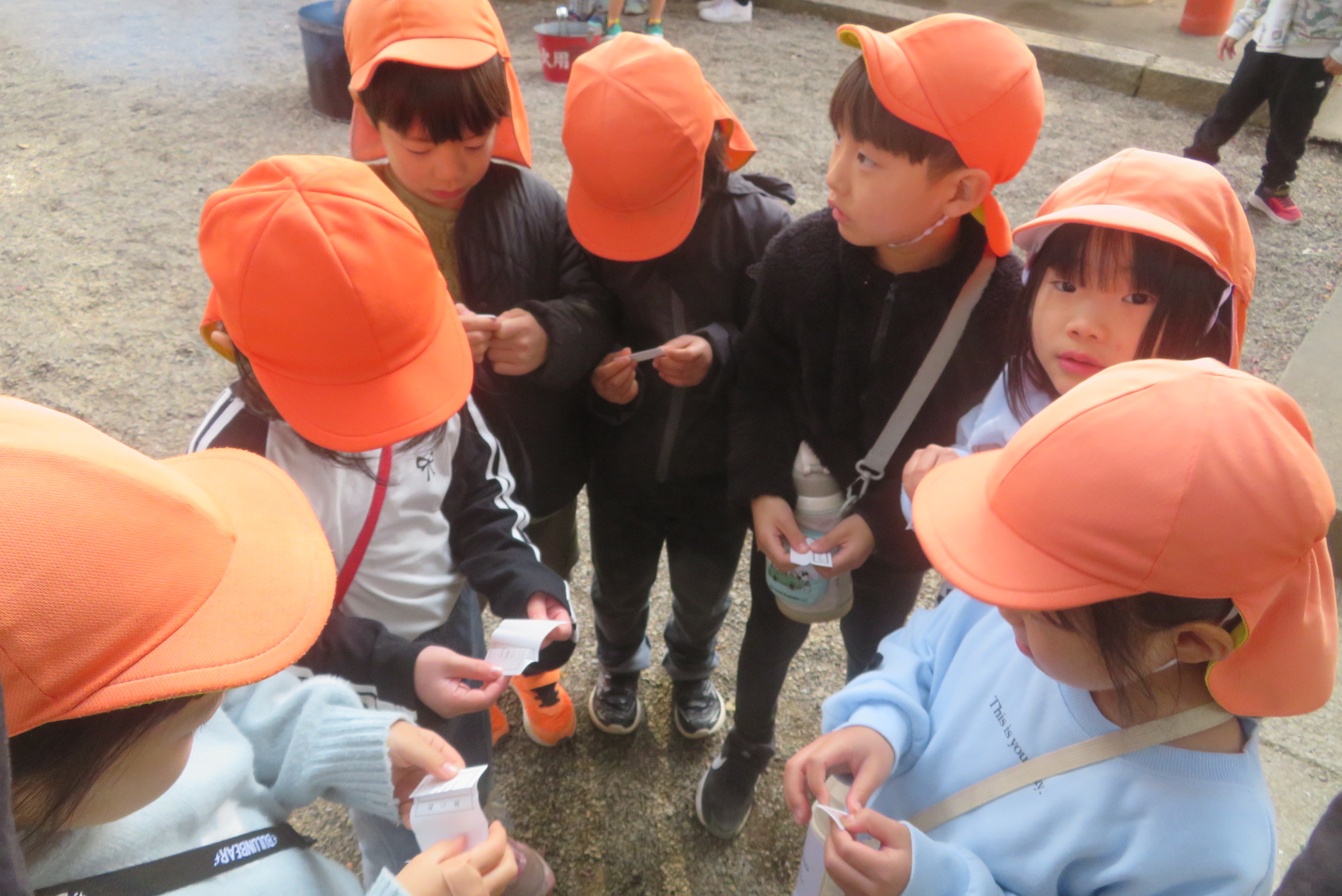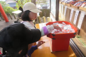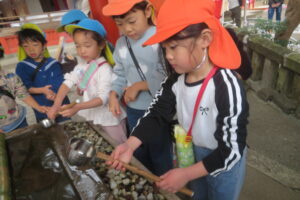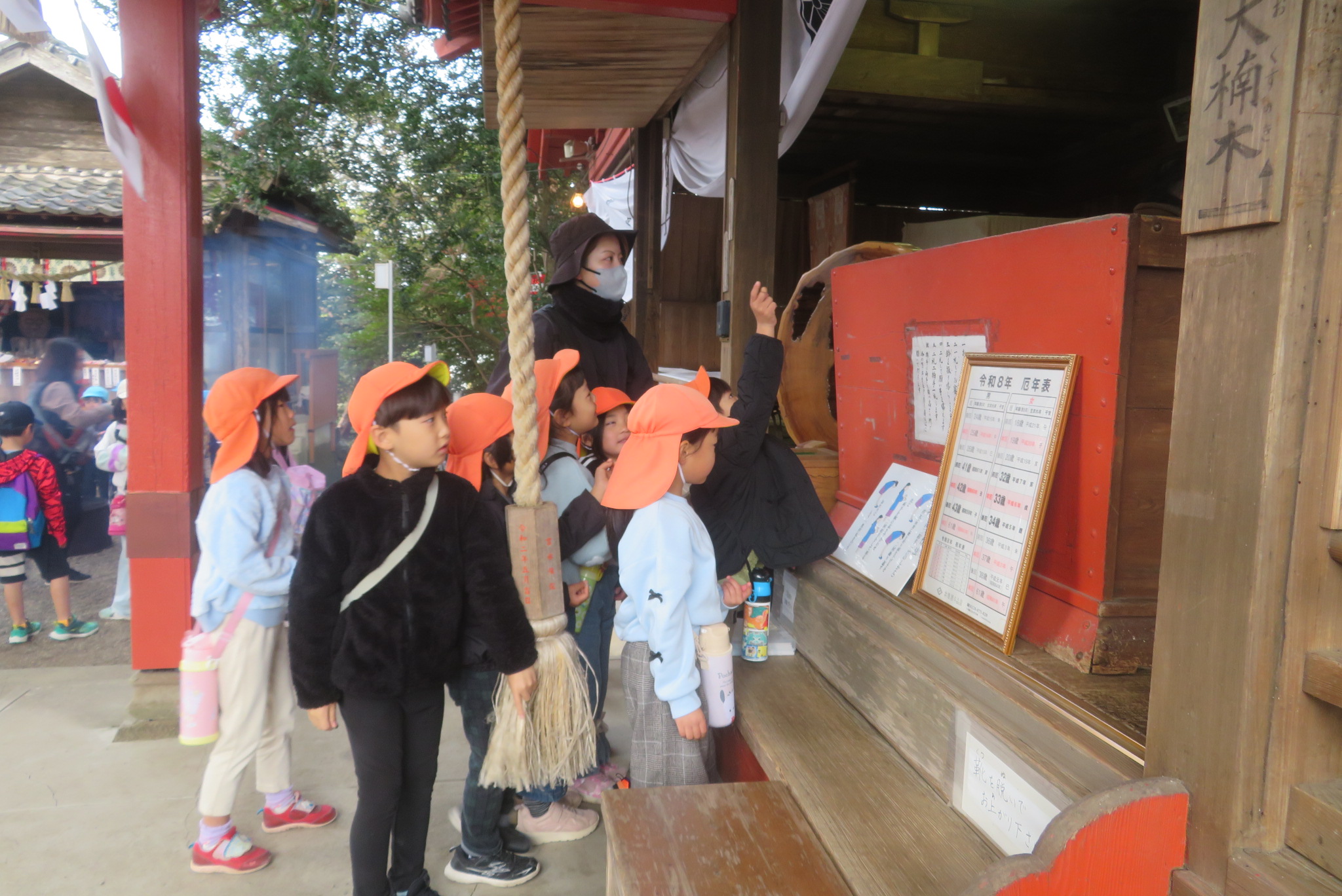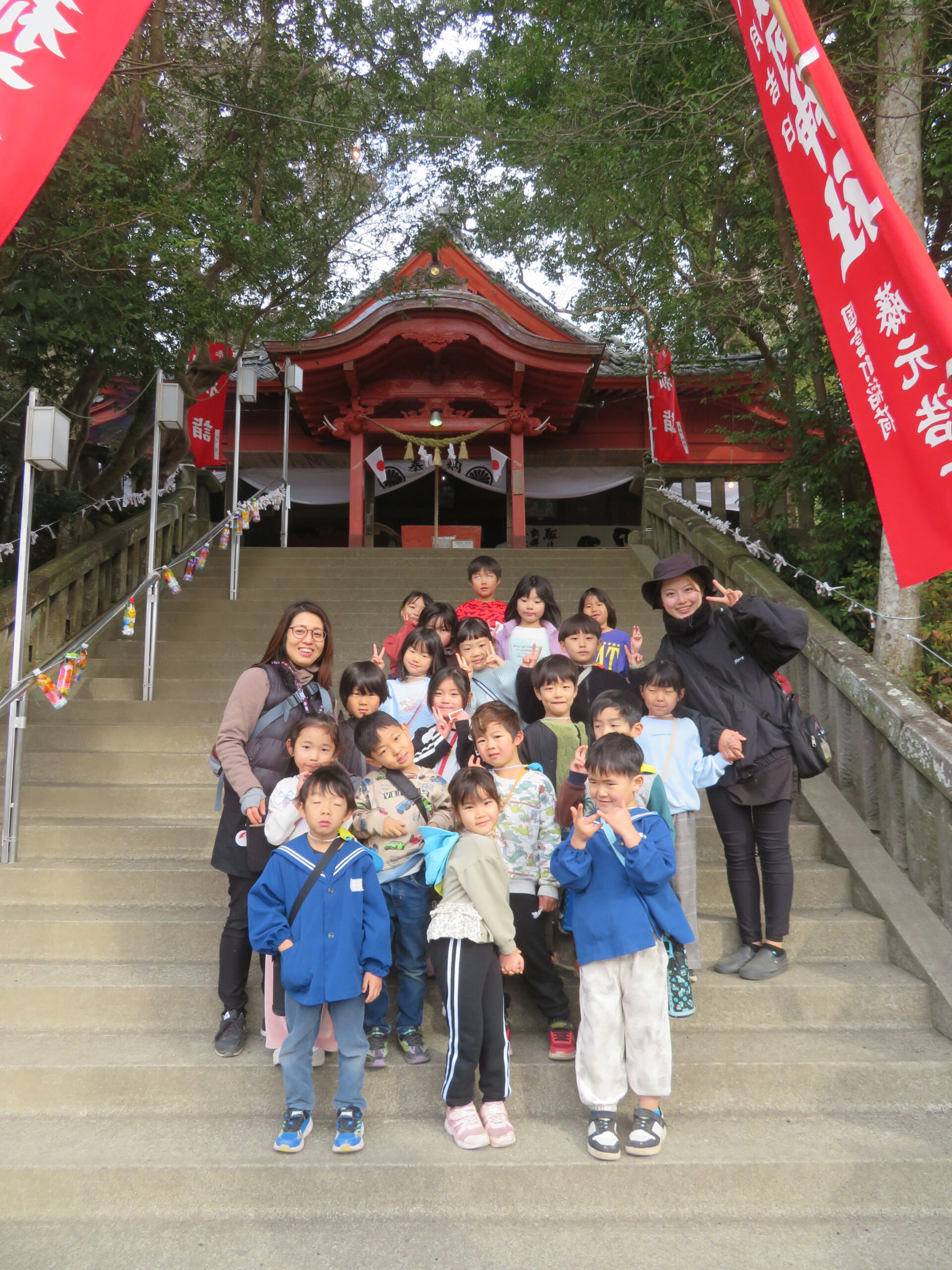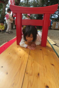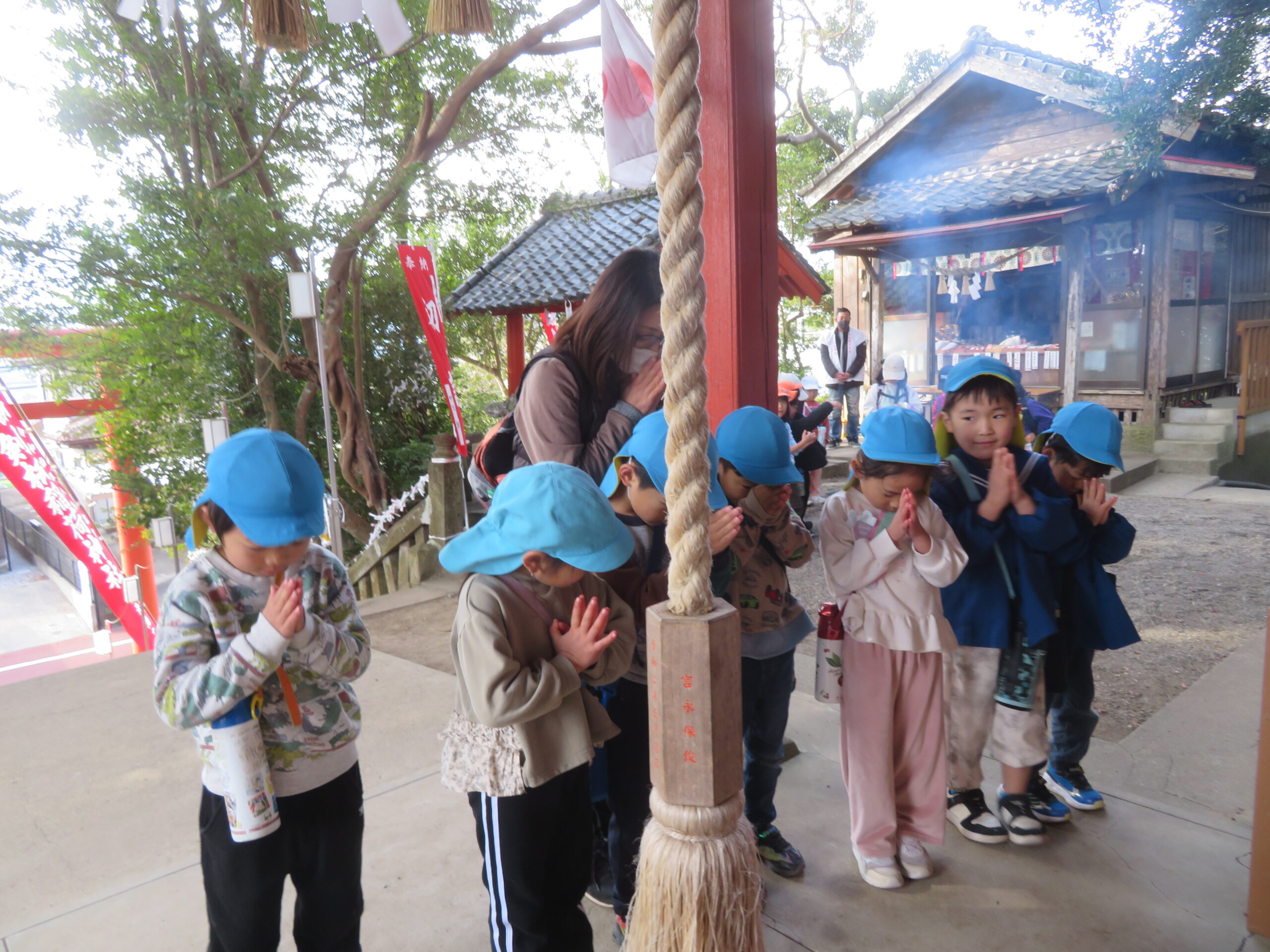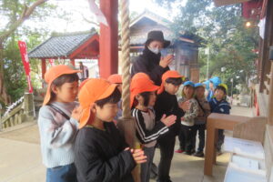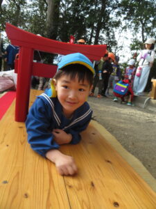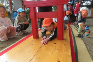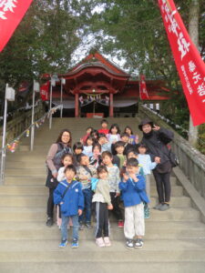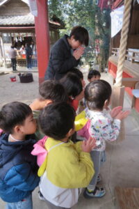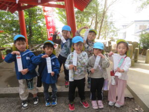 以上児と学童で、近くの稲荷神社へお参りへ歩いて行きました。神社に着くと、お参りをしたり、おみくじを引いたりしました。お参りでは、「今年も元気でいられますように」「小学生になってもいろいろ頑張れますように」とお願いしたよと子どもたちから報告がありました。おみくじでは、「見て~」と言いながら嬉しそうに保育者や友だちと見せ合っていましたよ。