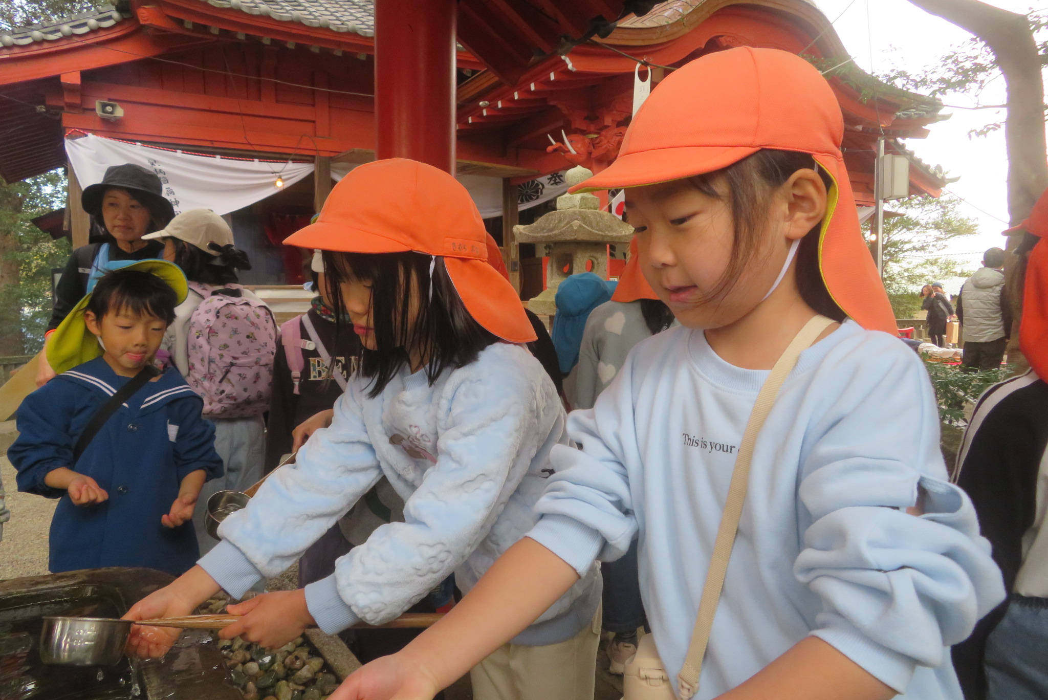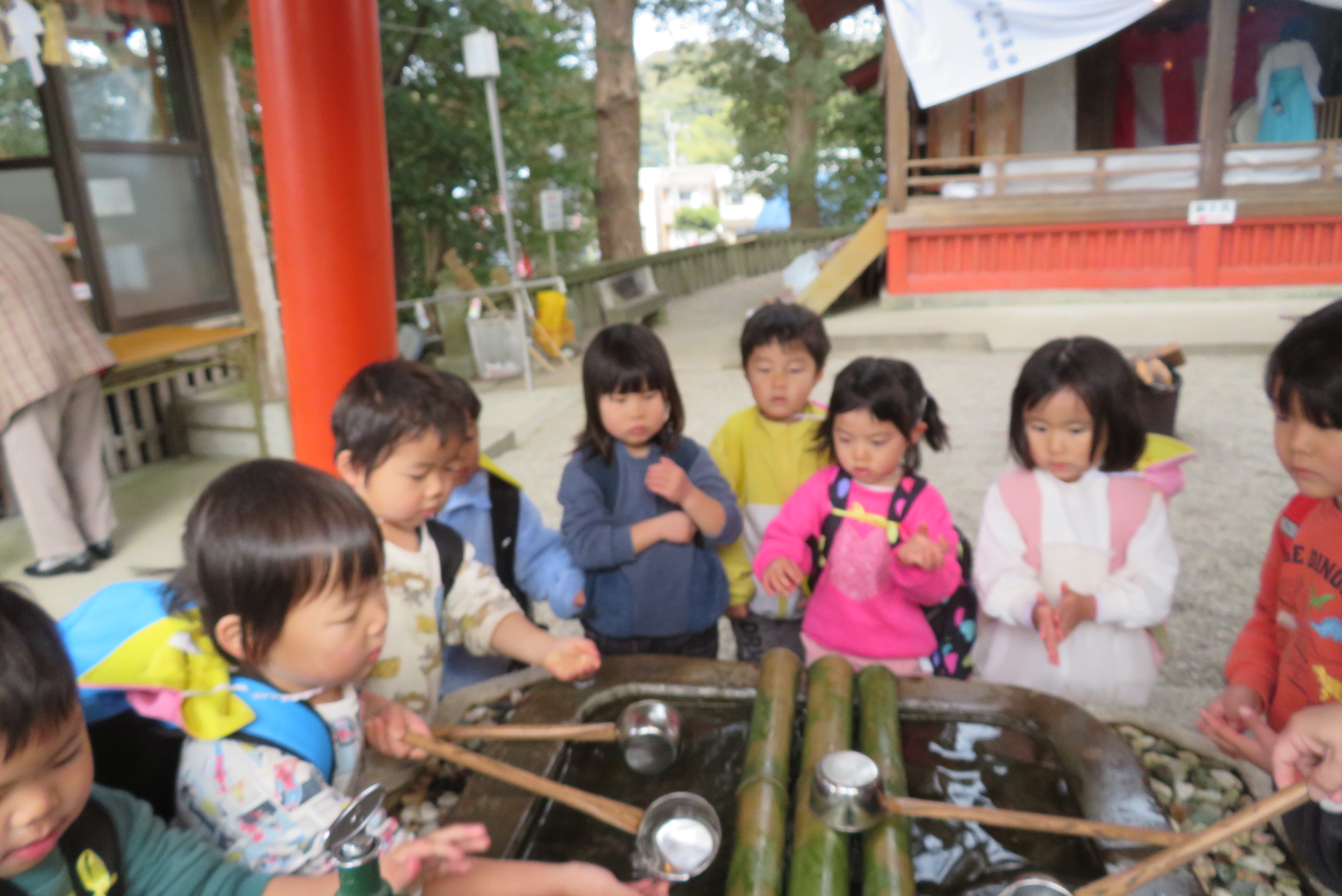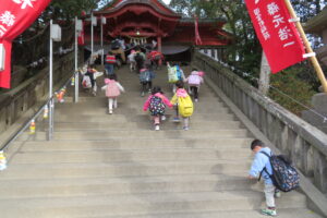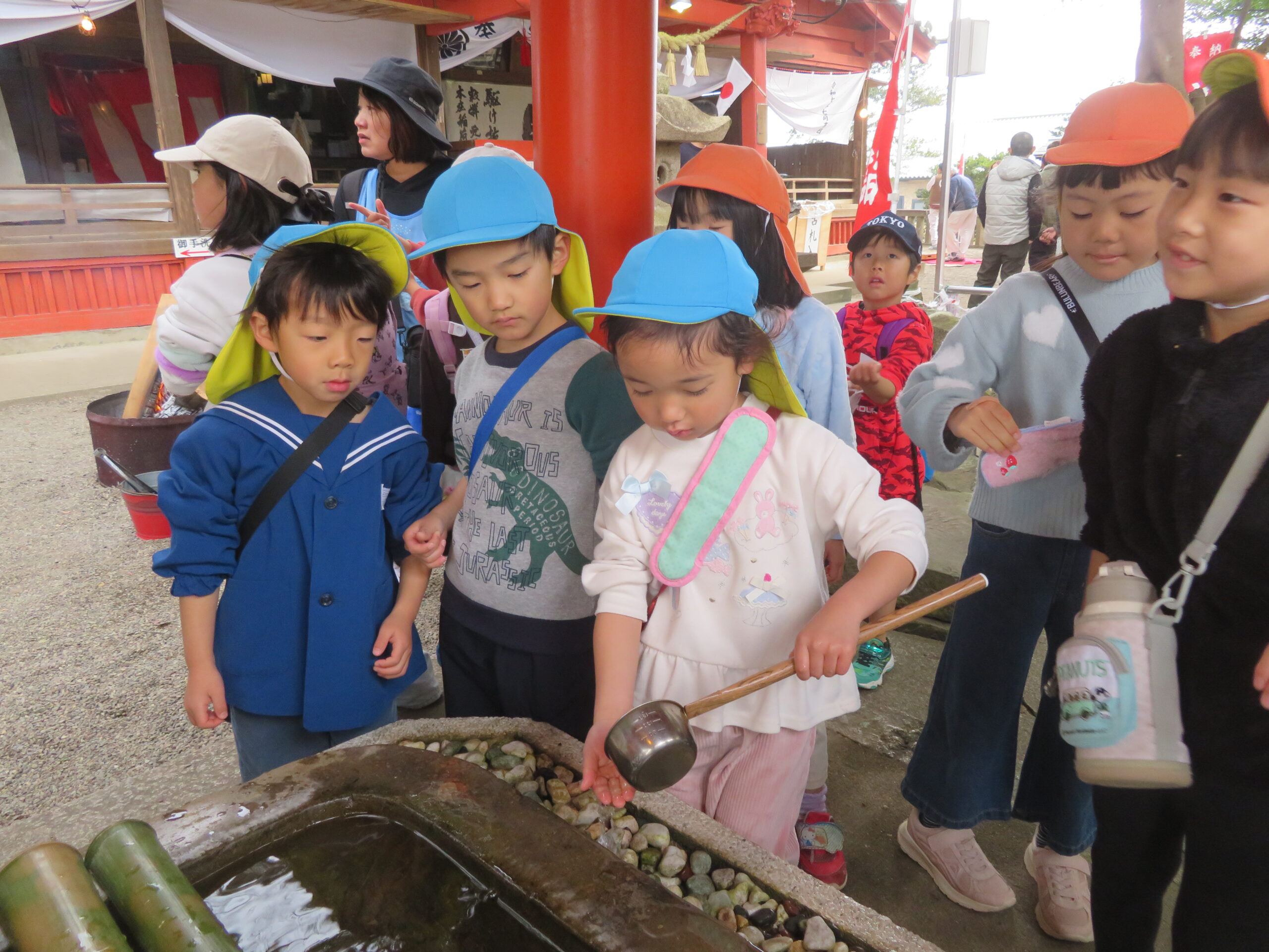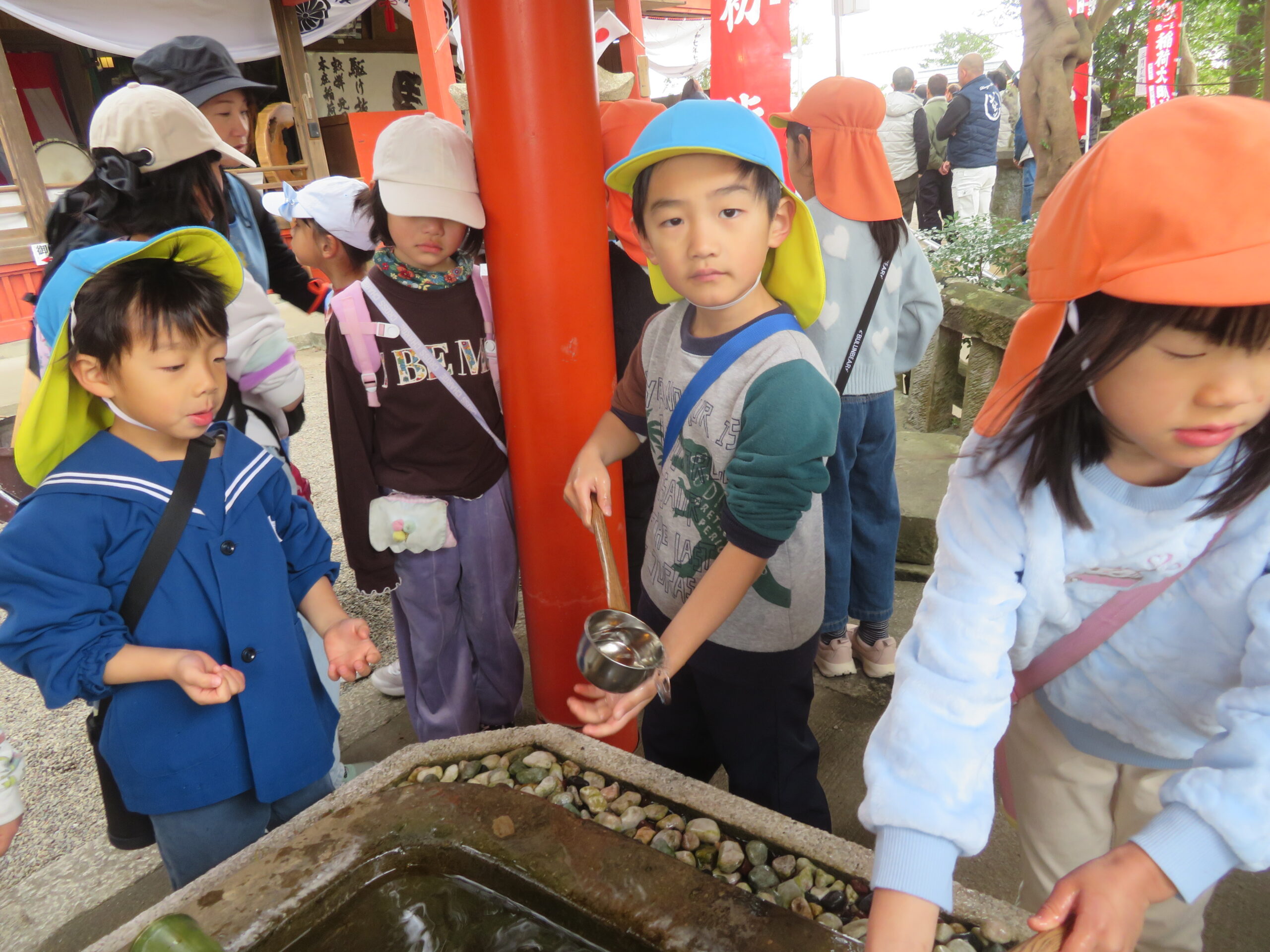 以上児と学童で、近くの稲荷神社へお参りへ歩いて行きました。神社に着くと、お参りをしたり、おみくじを引いたりしました。お参りでは、「今年も元気でいられますように」「小学生になってもいろいろ頑張れますように」とお願いしたよと子どもたちから報告がありました。おみくじでは、「見て~」と言いながら嬉しそうに保育者や友だちと見せ合っていましたよ。