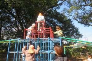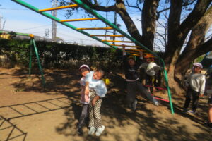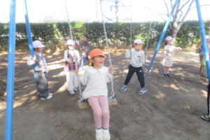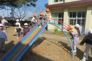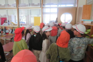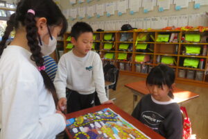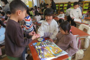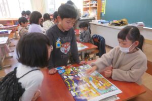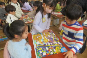 今日、年長児は、本庄小学校で1年生と交流をしました。毎日散歩していることもあり、本庄小学校までしっかりと歩くことができた年長さん。学校へ到着すると1年生の靴箱を見たり、給食ボードを見たり「楽しい」「ドキドキする」とウキウキな様子でした。1年生が算数セットの中から、時計を取り出し、先生の言われた時間に合わせている様子を見ると、「難しそう」「やってみたい」と授業にも興味を示していました。その後、1年生と一緒にすごろくをしました。「ここに座っていいよ」と自分の椅子を貸してくれる優しい1年生。すごろくが終わるころには、すっかり打ち解けて、手を繋いでトイレに行ったり、中庭で遊んだりして楽しい時間を過ごしていました。