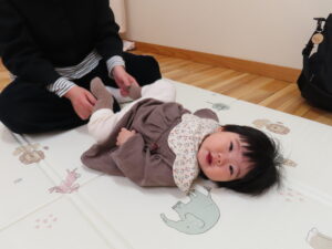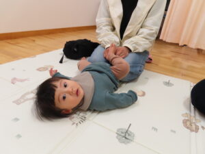一緒に絵本を見たり、「おふねをこいで」「きゅうりができた」「ららら雑巾」などたくさんの触れ合い遊びをしました。お母さんがこちょこちょをすると足をバタバタさせたり、声を出したりして喜んでいました。
