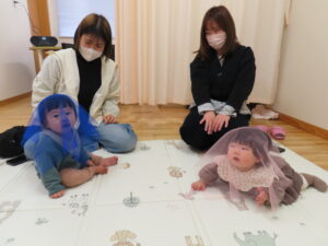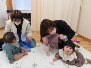その後、顔や体に布をかけて遊びました。お母さんたちが歌に合わせていないいないばぁで顔を出すとにこっと笑う様子がとっても可愛かったです。