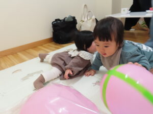 風船遊びでは、テープを貼った風船の重さの違いにお母さん方も驚いていました。子どもたちも風船マットを触ったり、風船を追いかけて楽しんでいました。