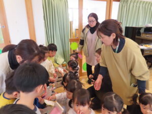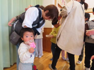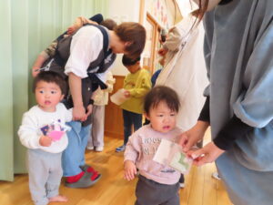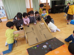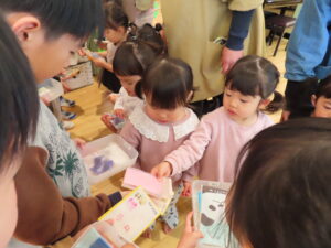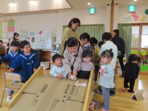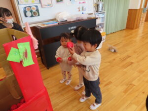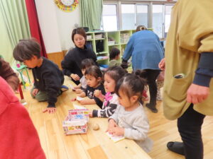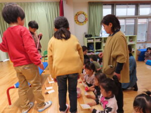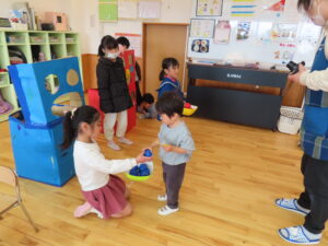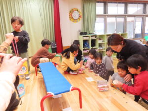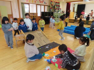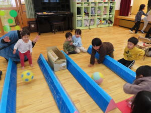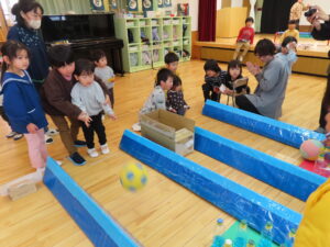 今日はお店屋さんごっこをしました。以上児が、ゲームを考えて製作を行い、未満児を招待しました。ボーリングや的あて、玉入れなど楽しいゲームがたくさん準備してあり、未満児のお友だちも大喜びで遊んでいました。楽しい思い出となりました。