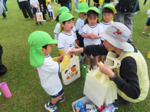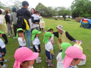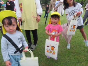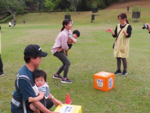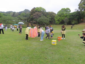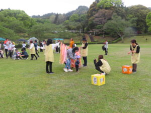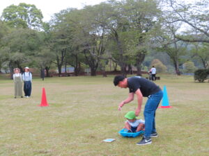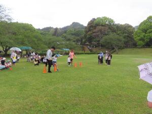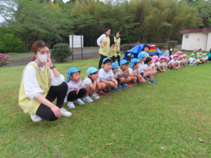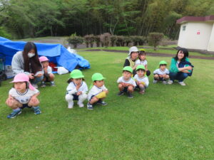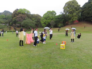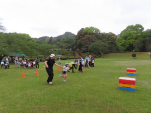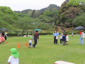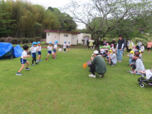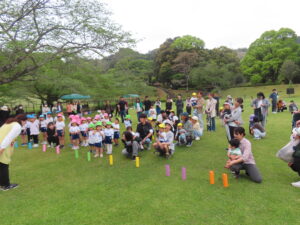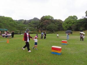 親子遠足がありました。天気予報は、くもりでしたが、現地に着いてから少し雨が降り始めたので、プログラムを短くし、開催しました。体操は、年長さんがみんなのお手本となり、ノリノリで踊ってくれました。その後、未満児ゲーム、以上児ゲームをしました。お父さん、お母さんと一緒にゲームをすることができ、靴が脱げたり、すべったりするハプニングもありましたが、子どもたちは大喜びでした。少しの時間でしたが、楽しい時間を共有することができ良かったです。ご理解とご協力、ありがとうございました。
